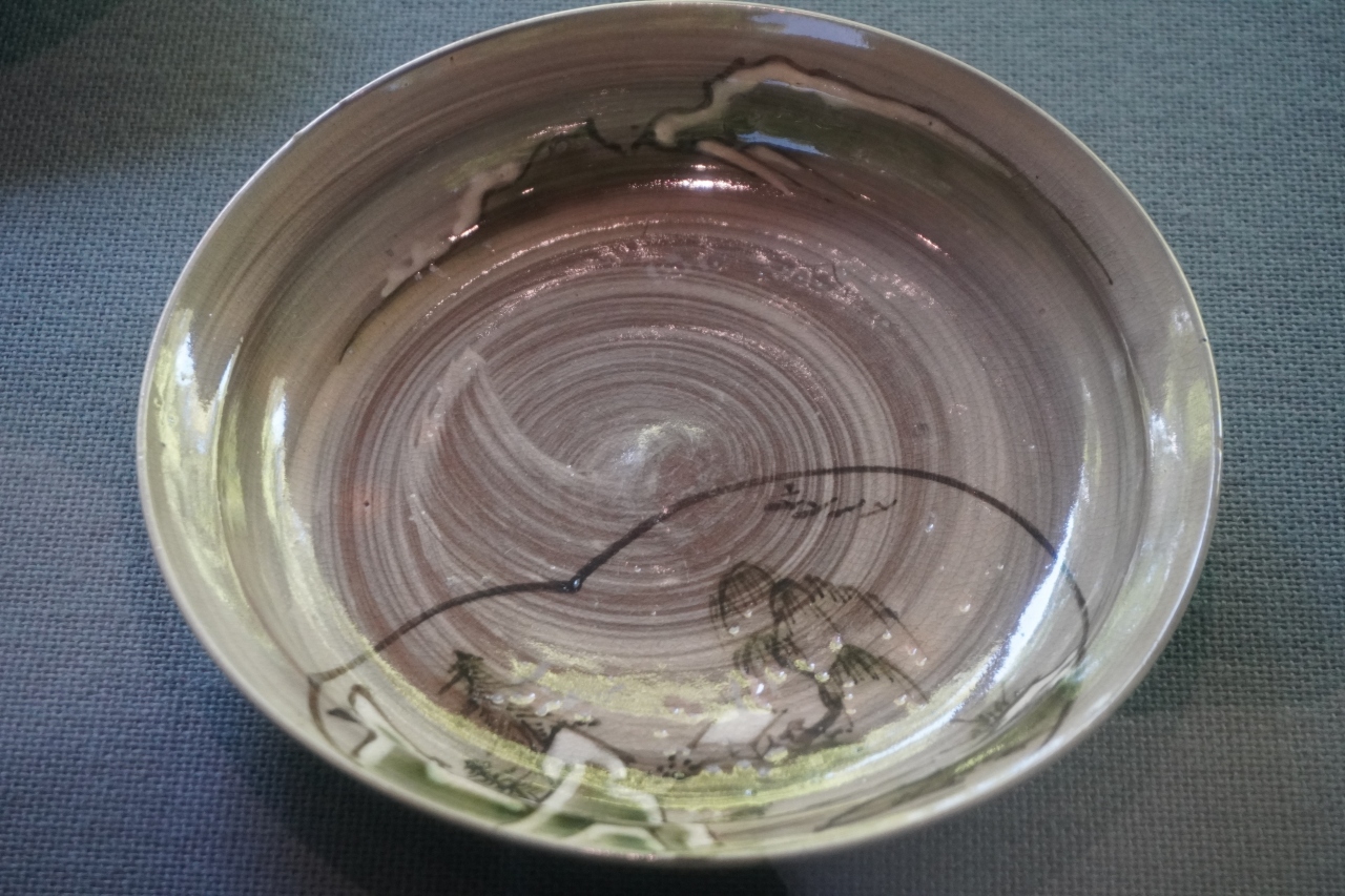 そして、見どころのもう一つは現川焼き。土で焼かれる陶器なのですが、磁器と同じくらい薄手で軽いのが特徴。元禄年間から60年くらいの歴史しかない幻の焼きものなのですが、チョコレート色の地色に白い釉薬を刷毛目やスポンジで叩いたような文様が美しいです。今は臥牛窯という窯で復刻されているのですが、いずれにしてもこちらのコレクションはとても貴重なものだと思います。