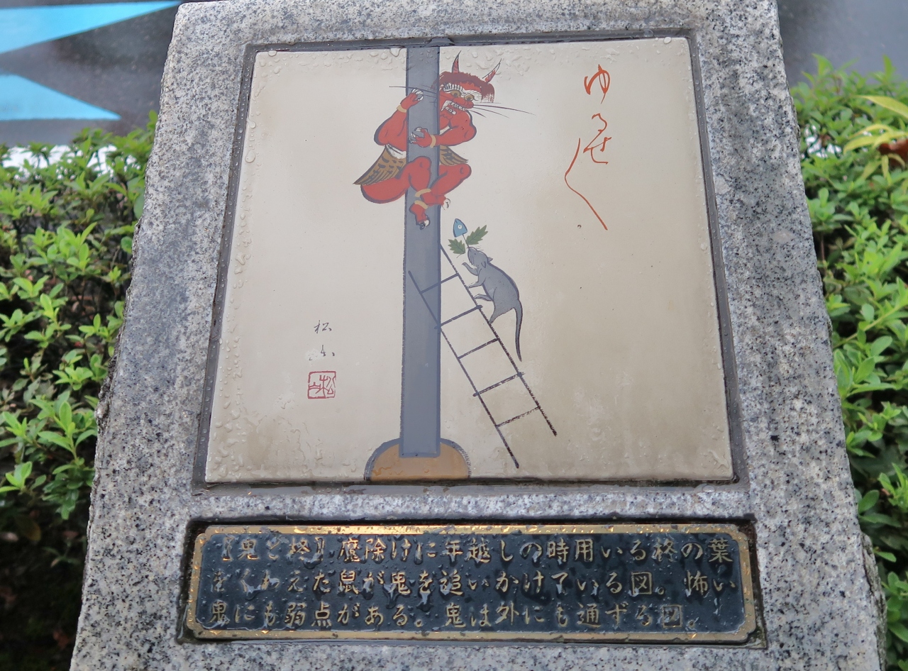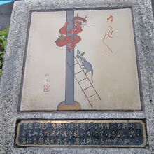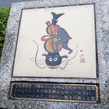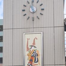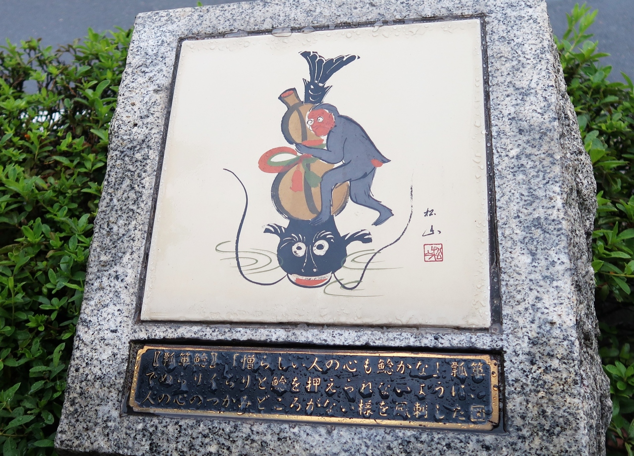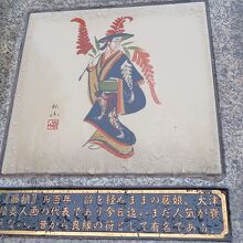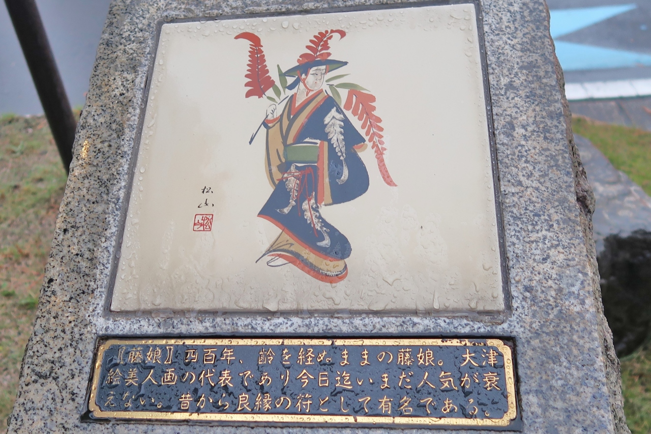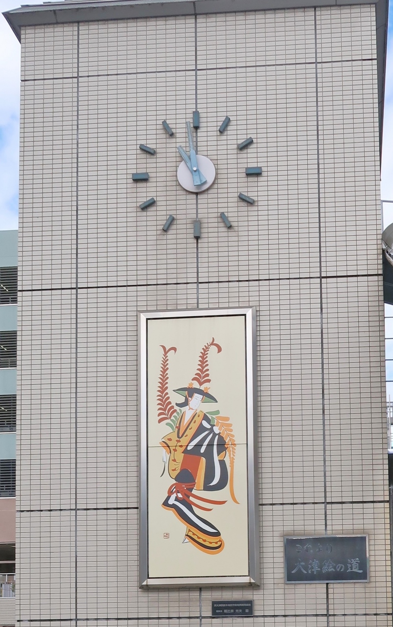 びわ湖浜大津駅からペデストリアンデッキ経由で明日都浜大津方面へ向かうと、大津絵の「藤娘」がある時計塔のような建物に「これより大津絵の道」との看板が出て、大津絵の道のスタート地点となっていました。ここから皇子山総合運動公園まで、大津絵で装飾された散策路が続きます。大津市役所前の歩道の大津絵には、絵の解説もありました。