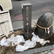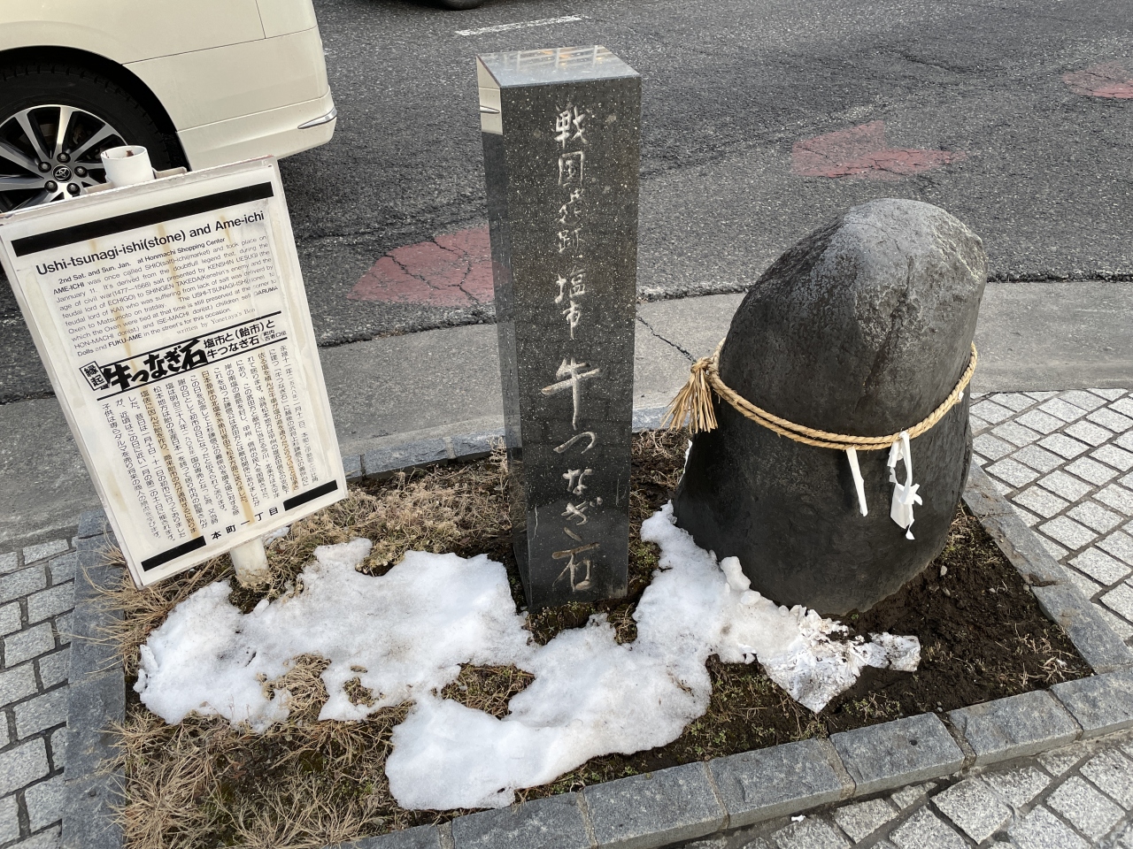 近代ビルが並ぶ大通りの信号交差点の片隅にしめ縄の巻かれた不思議な石があります。それが牛つなぎ石です。この石に牛を繋いだというのは作り話で、正体はこの地にあった道祖神だそうですよ。上杉謙信の「敵に塩を送る」の美談で、塩を牛に積んで運んだことから話が誇張されて伝わっているそうです。