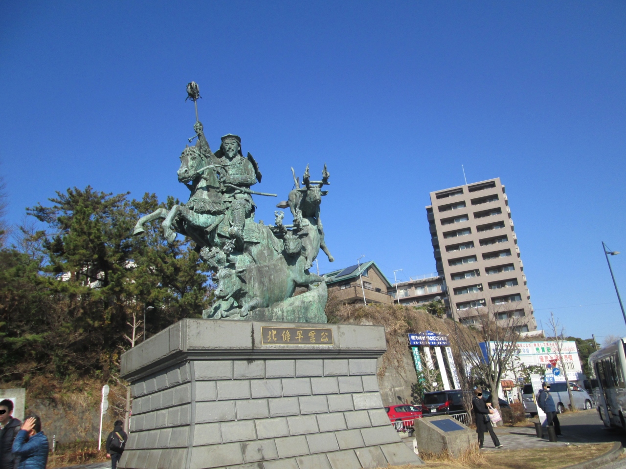 JR小田原駅改札口を出て、西口の階段を降りると正面に建っています。十六世紀、関東の覇者となった後北条氏の初代です。筆者が子供のころ、早雲は一介の素浪人から戦国大名にのし上がった下剋上の典型と本に書いてありましたが、現在では室町幕府の要職を務めた伊勢氏の支流出身であることが通説となる。本名は伊勢新九郎盛時(長氏)で、盛時死後、北条第二代氏綱の時代に、北条早雲と名付けられたようです。像は角に松明を付けた牛を従える騎馬に乗った勇ましい武将の姿です。1000頭の牛の頭に松明をつけ小田原城を攻め落とした話をモチーフにした像です(牛に松明は倶利伽羅峠で源義仲が平家軍を破った時も、この戦法を採用したと聞いたことがあります