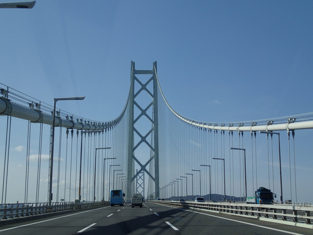 本州、神戸市と淡路島、淡路市との間に架かっている、約4kmの巨大吊橋です。建設中に安心淡路大震災が起こり、主塔の基礎が地盤ごと動いてしまっていますが、構造影響の再計算から問題なしとして、工事が進んだようです。ケーブル部分には乾燥空気を送り込んで画期的な腐食防止策をしています。
