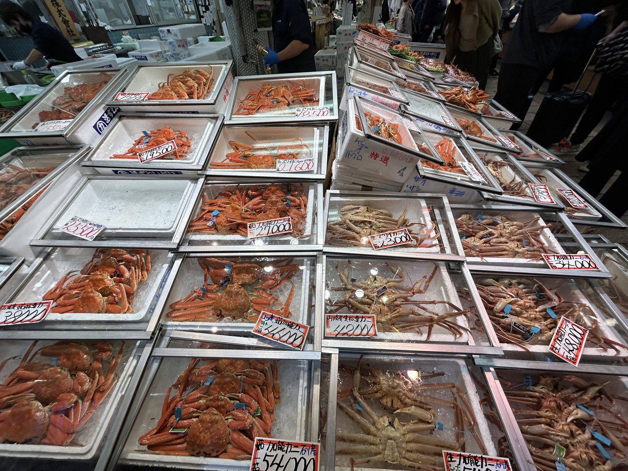冬にはあちこちのお店で蟹が並び、海の幸や野菜、果物など色々な物が売っています。