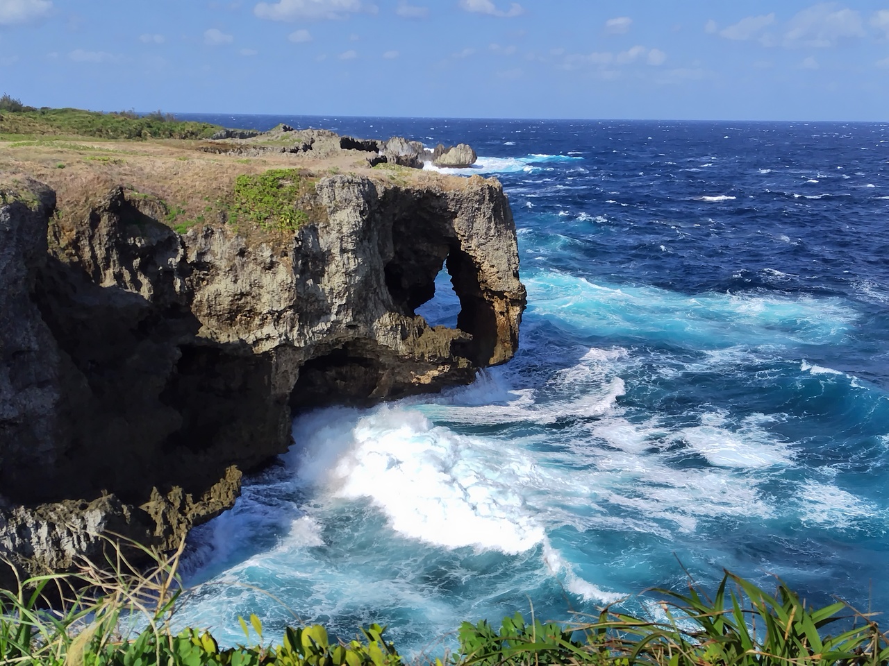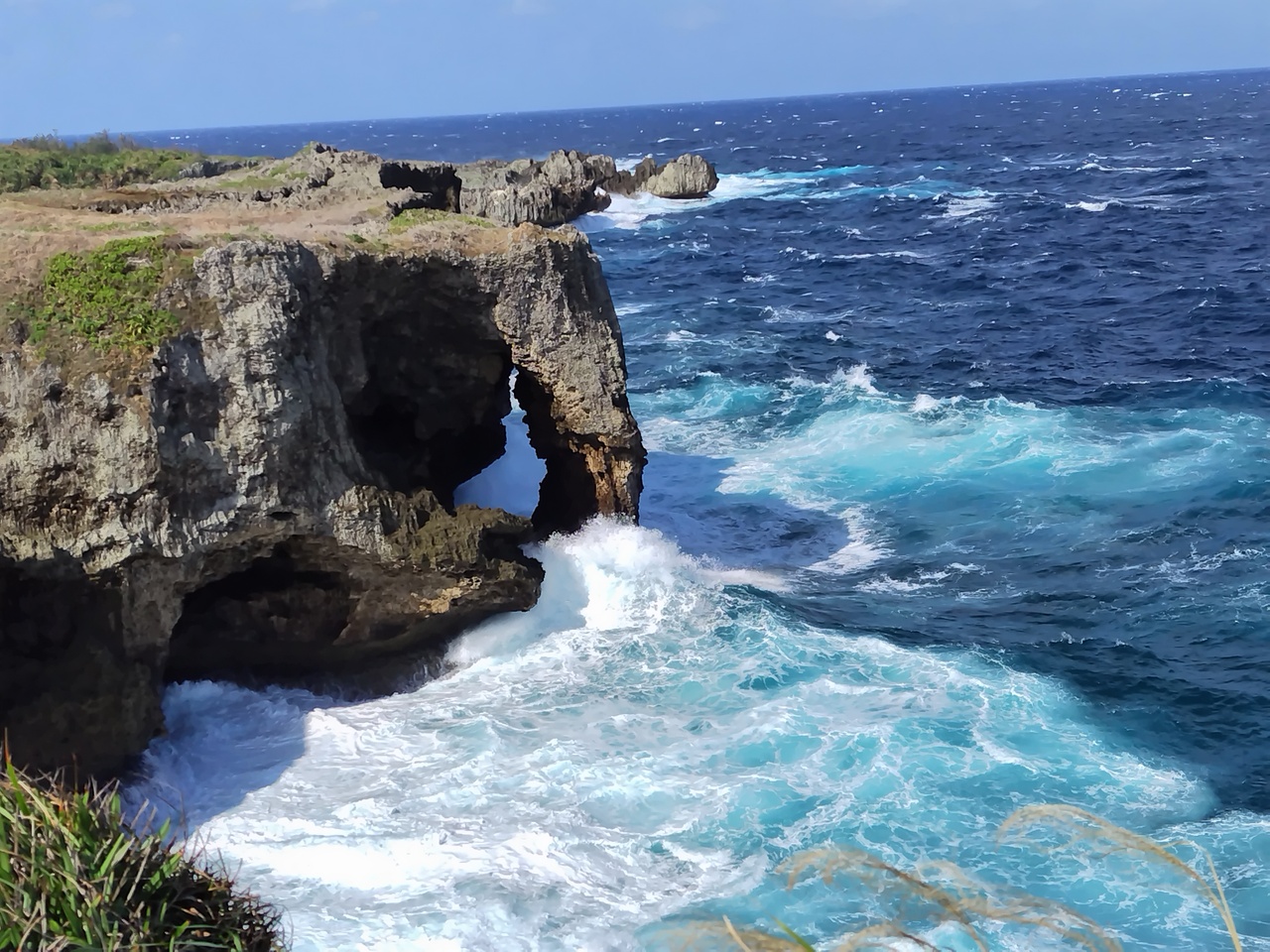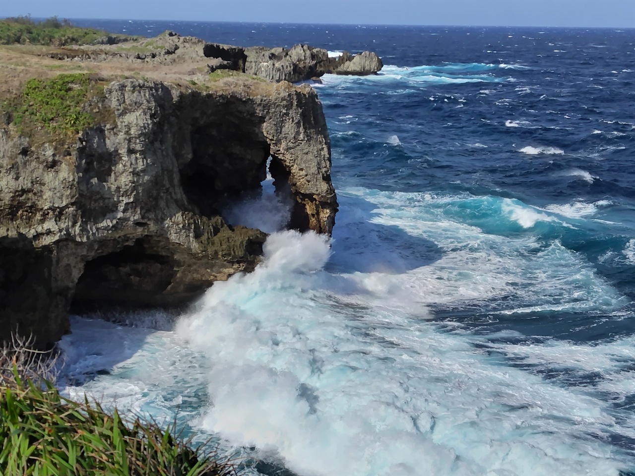 強風で白波の万座毛