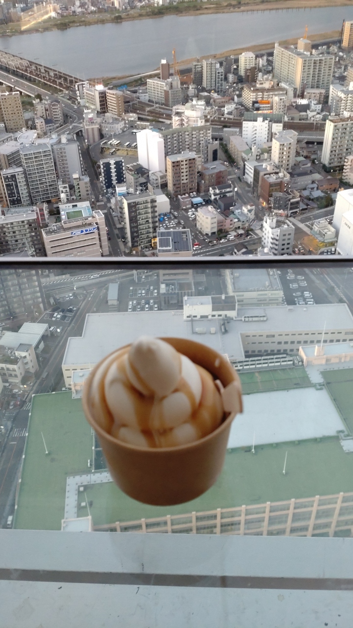 梅田スカイビル展望台にあるセルフのカフェ&バーです。カウンター席の他、テーブル席もあり、運よくカウンター席に空きがありました。足元やテーブルもガラス張りなので、アイスを食べながらひと休み、大阪市内を見ることが出来ました。