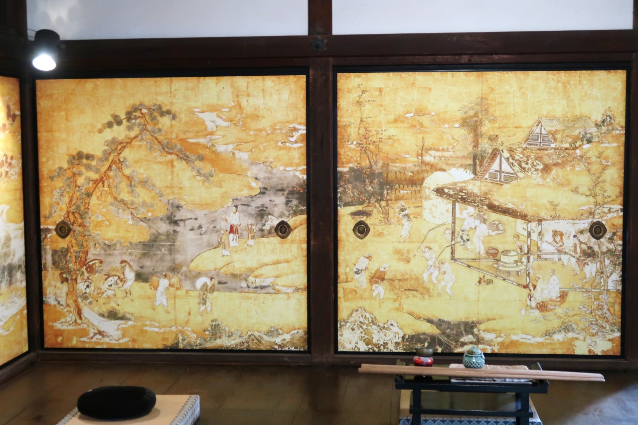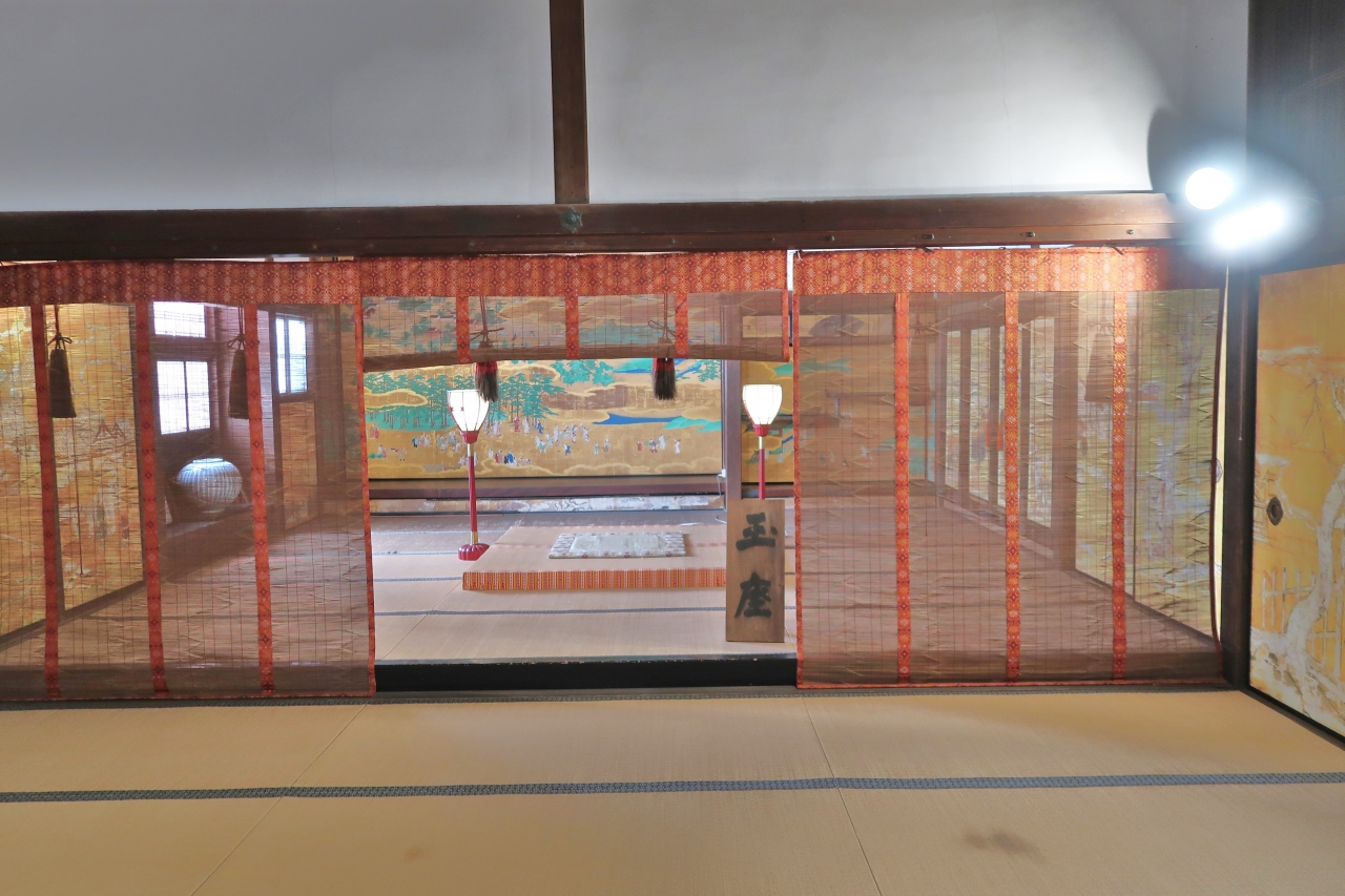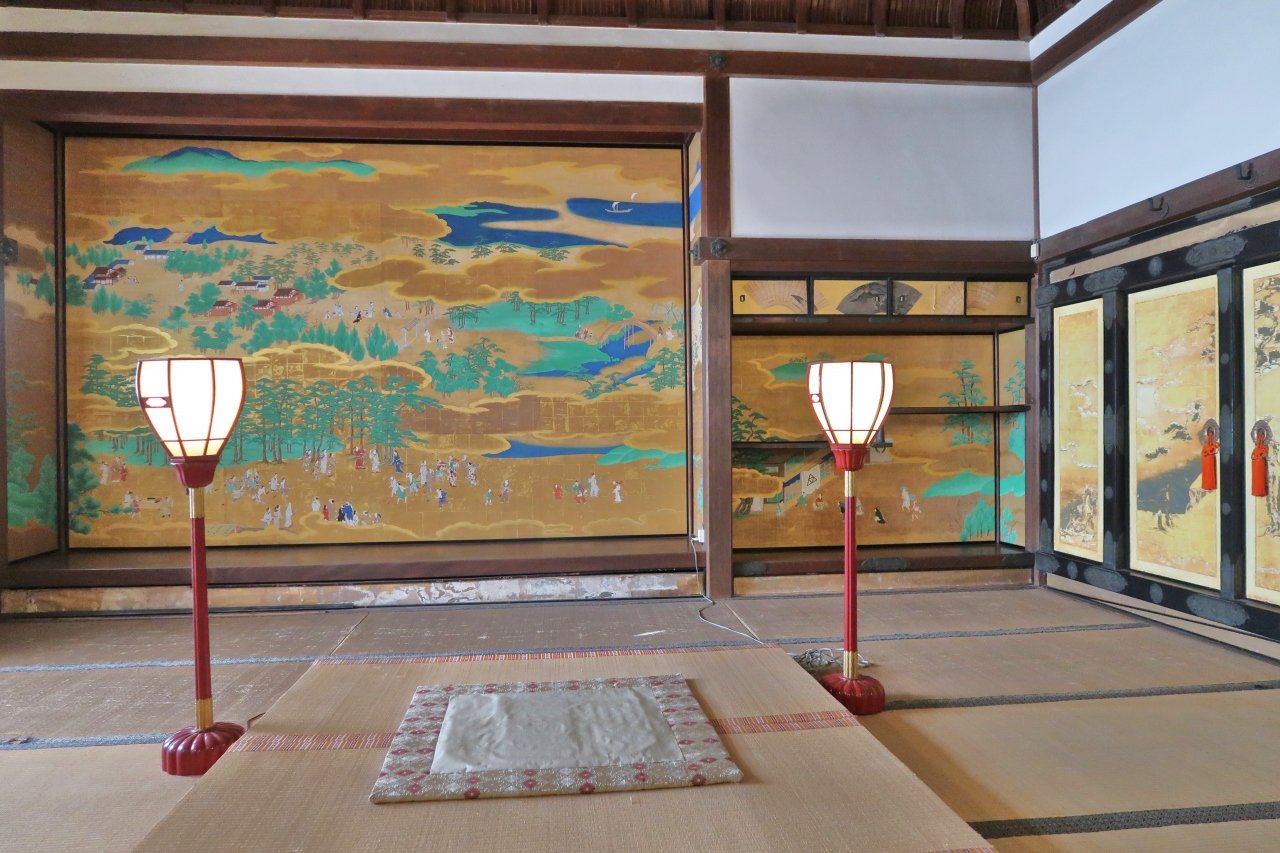 大津絵美術館鑑賞後、重要文化財の宸殿も見学できるとのことで立ち寄りました。1647年に京都御所から移築したもので、狩野探幽など狩野派の障壁画はレプリカのようですが、それでも見ごたえがありました。もともとは徳川秀忠の娘の和子姫が入内する時に建てられた建物なので、後水尾天皇が実際にお座りになった玉座も御簾越しに見え、ベールに包まれた天皇、中宮の生活が垣間見えるようで、興味深い展示でした。三井寺のお隣にある穴場スポット、お時間があれば立ち寄られることをお勧めします。