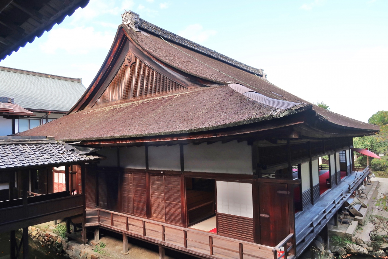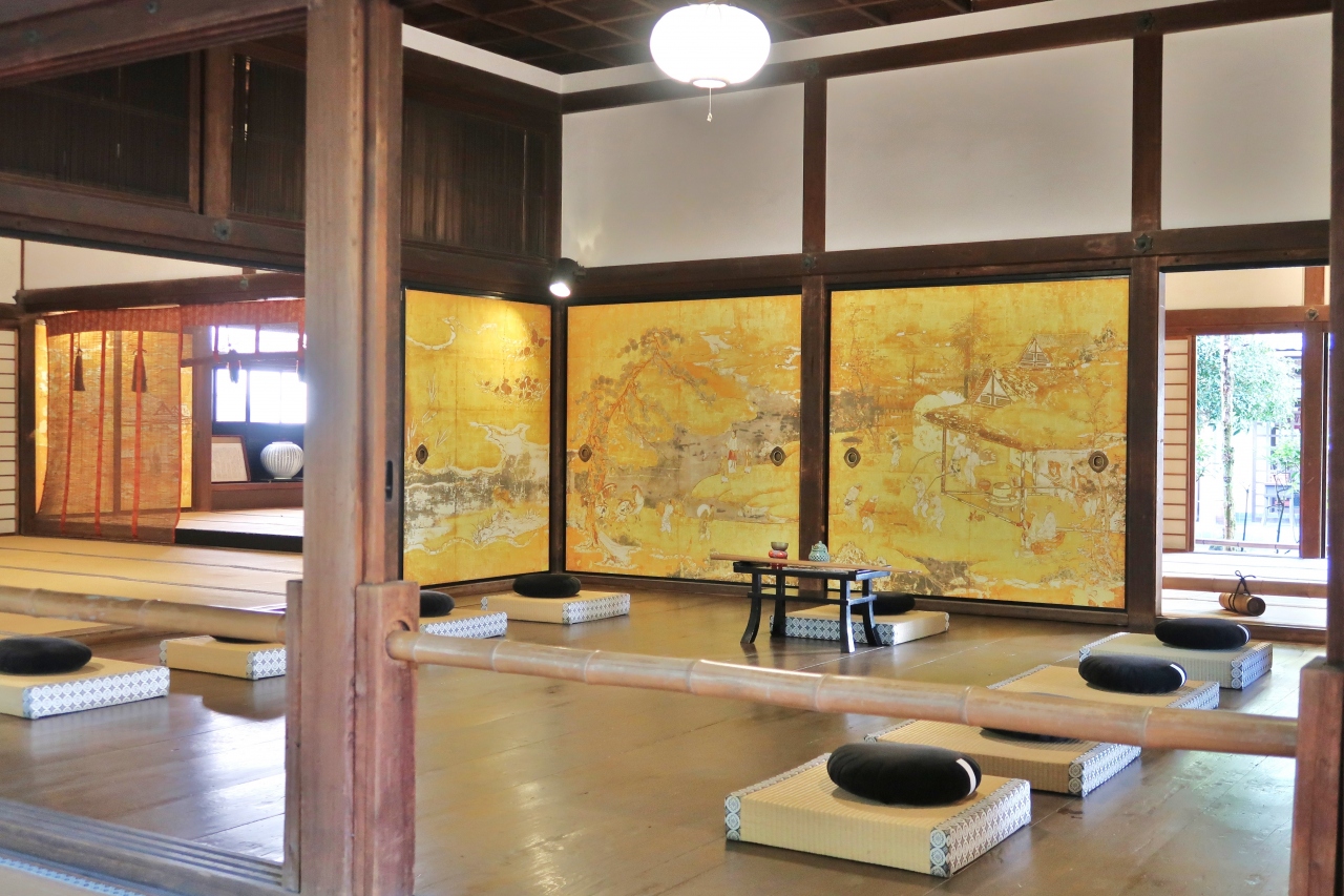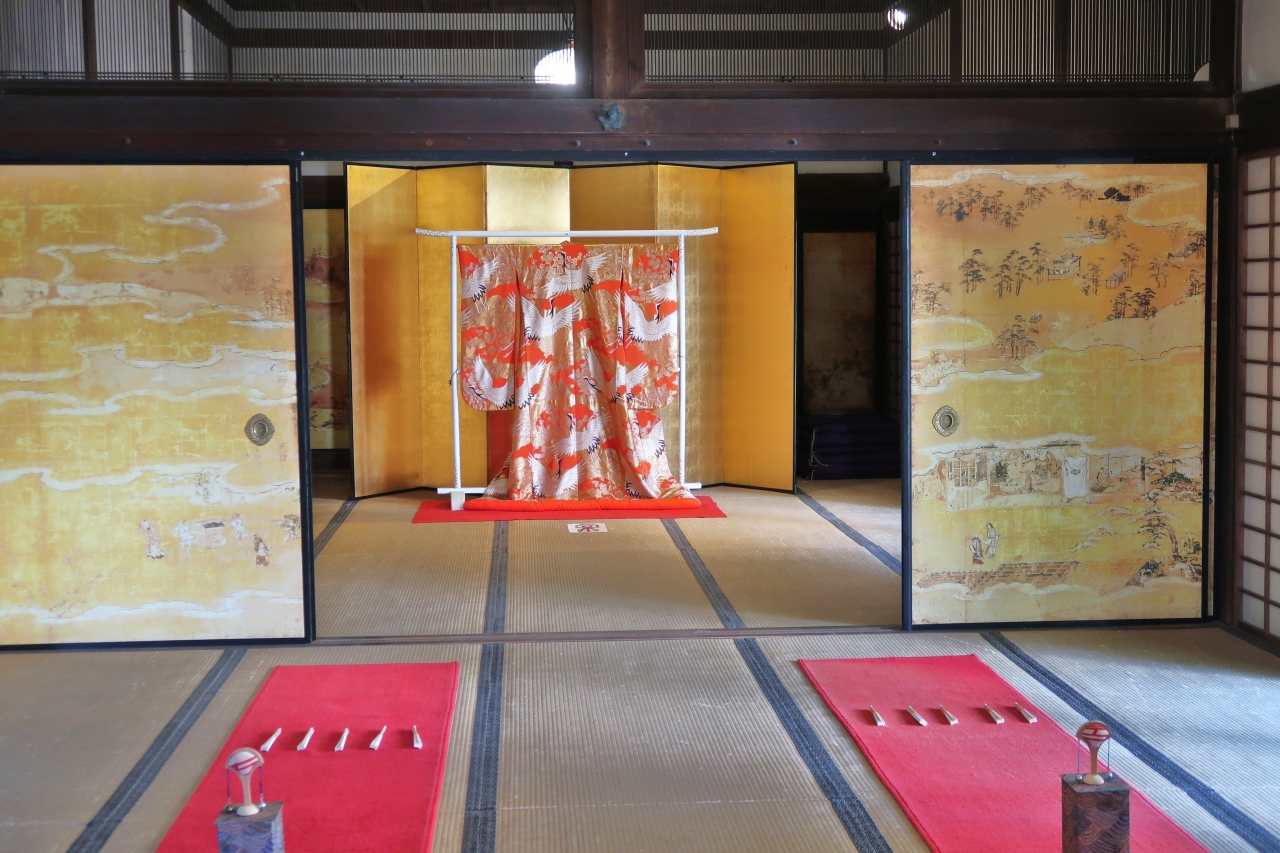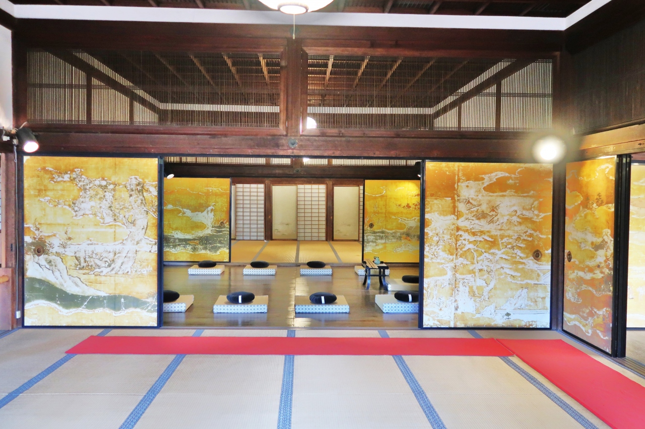 大津絵美術館鑑賞後、重要文化財の宸殿も見学できるとのことで立ち寄りました。1647年に京都御所から移築したもので、狩野探幽など狩野派の障壁画はレプリカのようですが、それでも見ごたえがありました。もともとは徳川秀忠の娘の和子姫が入内する時に建てられた建物なので、後水尾天皇が実際にお座りになった玉座も御簾越しに見え、ベールに包まれた天皇、中宮の生活が垣間見えるようで、興味深い展示でした。三井寺のお隣にある穴場スポット、お時間があれば立ち寄られることをお勧めします。
