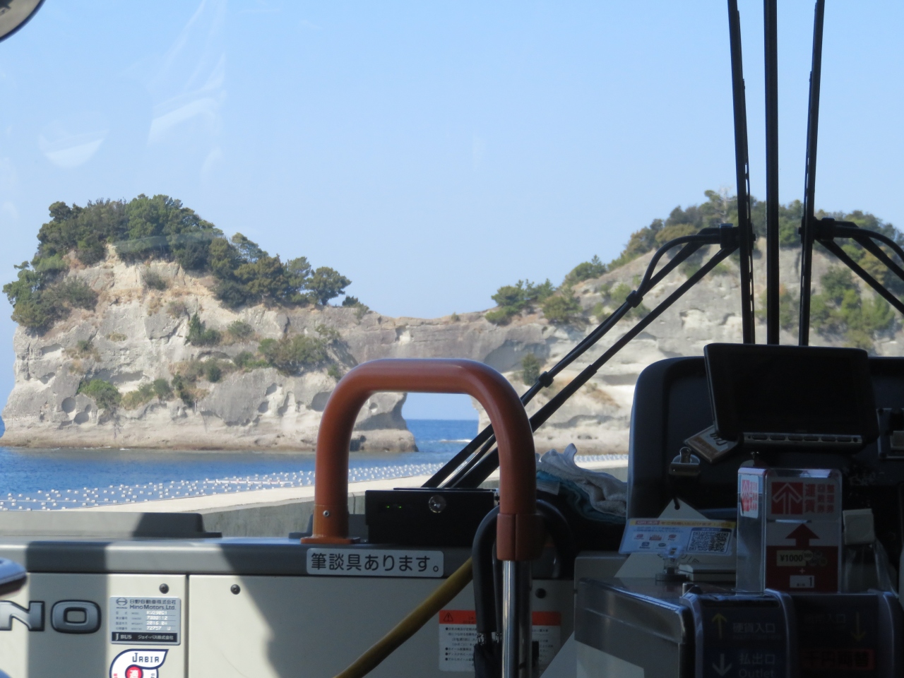白浜に来たからには円月島を観なければならないと、最終日わざわざ臨海経由のバスに乗車、せめて車窓からでもと左側の席をとっていたが、なんとラッピングバスで車内からは風景がほとんど見えず、結果かろうじてフロントガラス越しに円月島をチラ見することしかできませんでした。