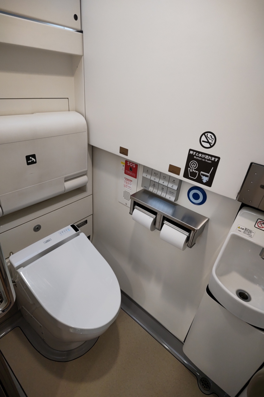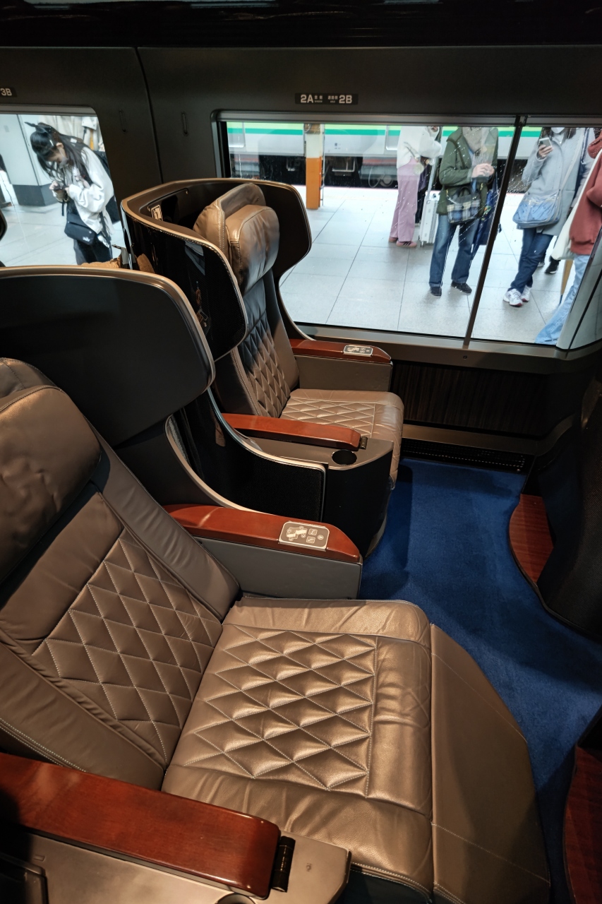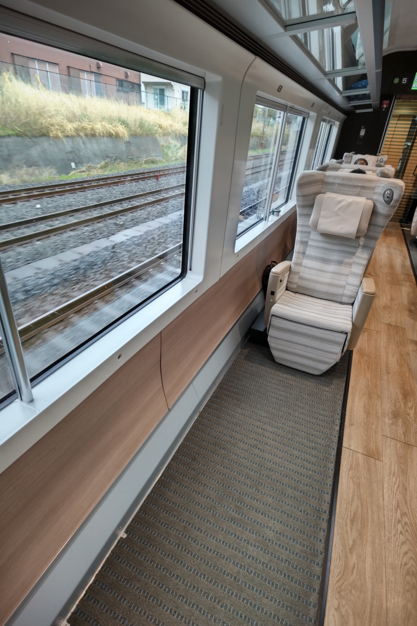 今回は上手く10時打ちでプレミアムグリーンが予約できたので、めでたく乗車となりました。そんな1号車のプレミアムグリーン席は2列のゆったりした座席が並び、電動リクライニング&レッグレストという豪華さ。ただプライベート感を出すシェルに圧迫感があり、前面展望も最前列でないと厳しい感じ。通路側からだと景色の見え方も中途半端で、この辺りは評価が別れそうです。