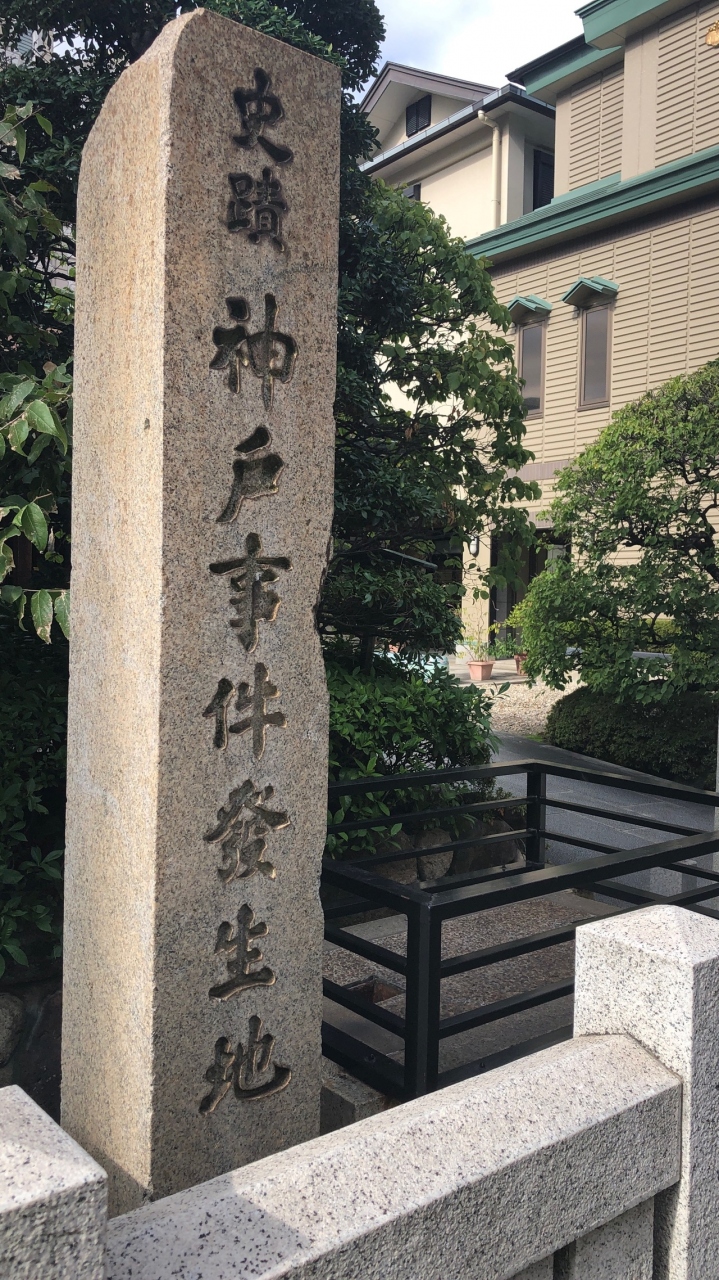 三宮神社の中にある石碑です。三宮神社は、大丸百貨店の近くにあります。神戸事件は、明治時代に起きました。日本の兵が、隊列を横切ったフランス人を、刀で切りつけたという事件です。これがもとで、諸外国との関係が悪化しそうになりました。