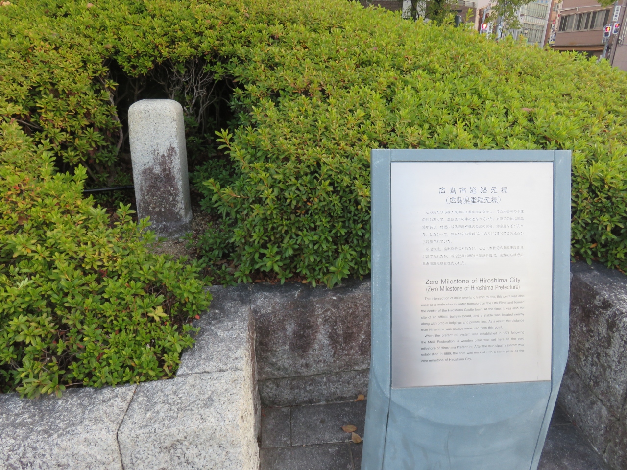元安橋の東側にあり、橋を渡る手前の植込みに埋もれるようにして表示されていました。以前は、このあたりが陸上交通の主要街道が交差する交通の要所だったそうで、太田川の水運の利用もあり、広島城下の中心としての道路元標が建てられたようです。