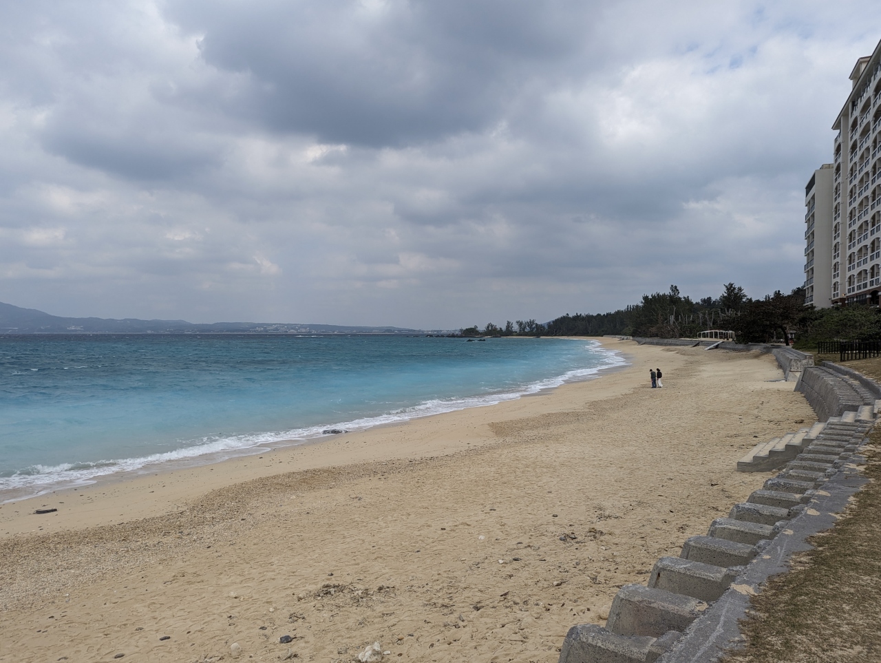 国道58号線を北上し、ベストウェスタン沖縄幸喜ビーチの手前にあるビーチである。駐車場やトイレ、シャワーも完備しているが、あくまで利用は無料のビーチである。さすがに1月には泳いでいるもの好きはいなかったが、シーズンを迎えると子連れが多く楽しんでいる姿を見かける場所である。
