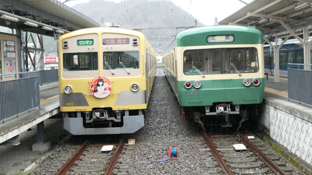 三島と修善寺を結ぶ伊豆箱根鉄道の路線です。古い車両がゴトゴト走る沿線風景は、背景に富士山という贅沢な田園風景が続きます。