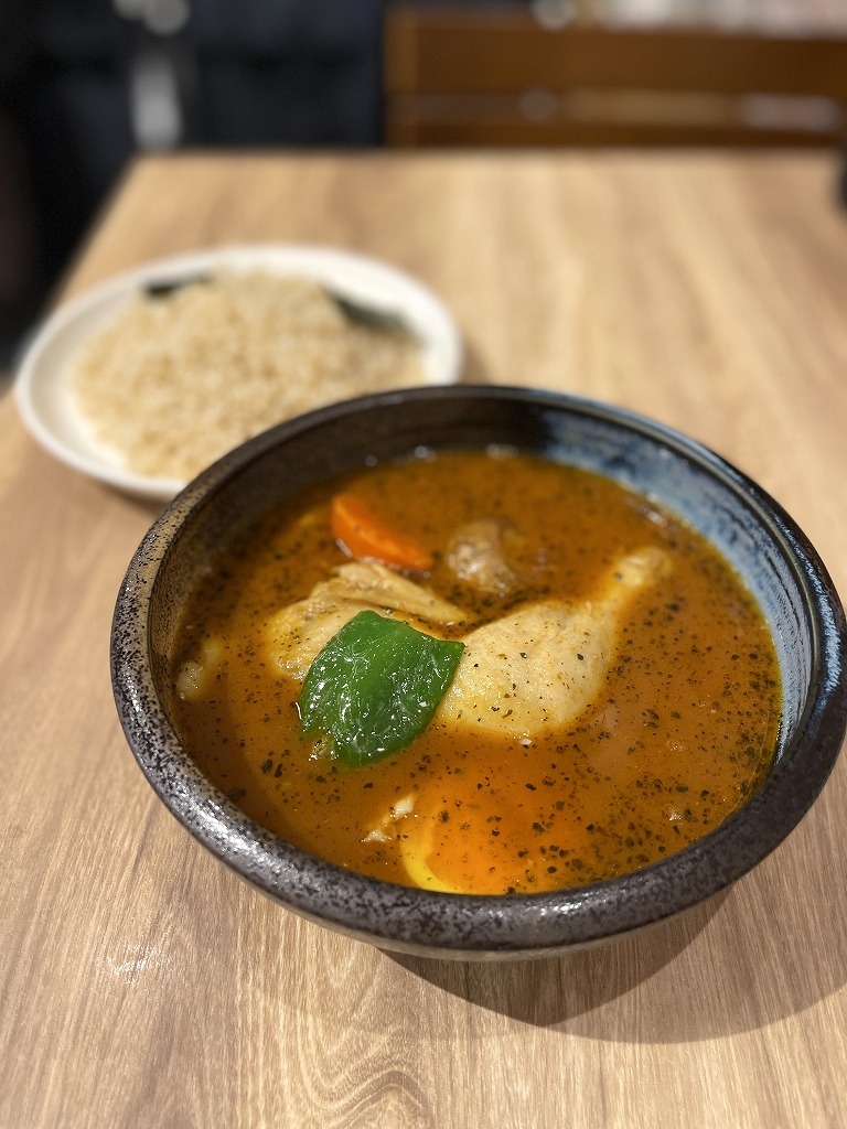 たっぷりと入ったスープカレーの中に骨付きチキンが見えています。