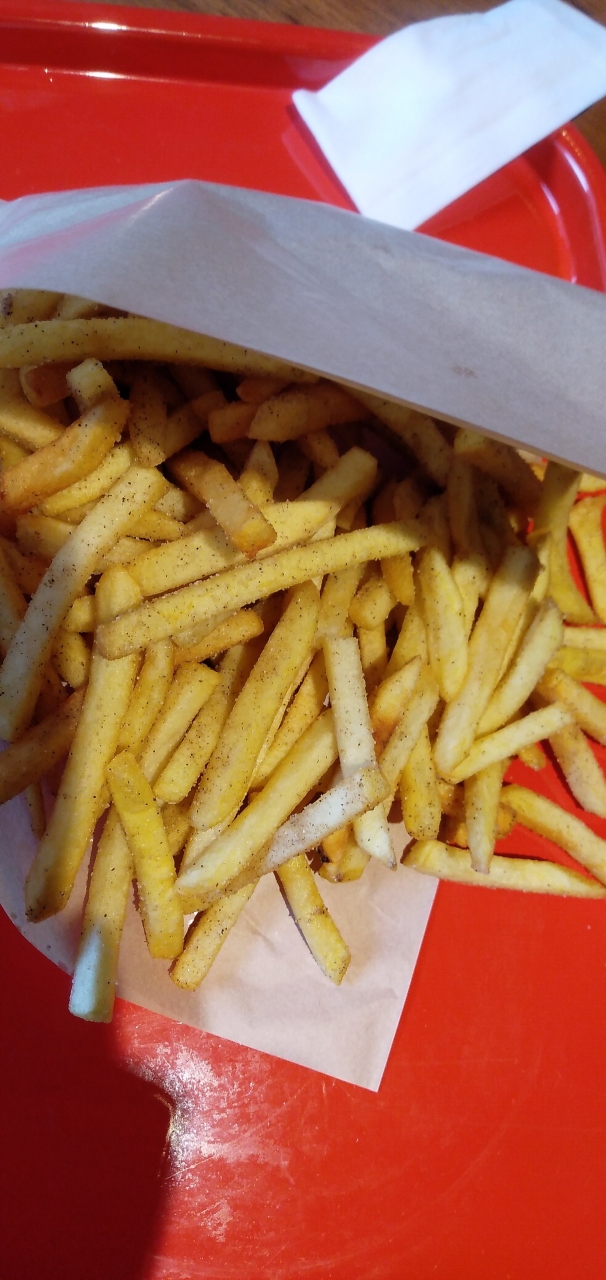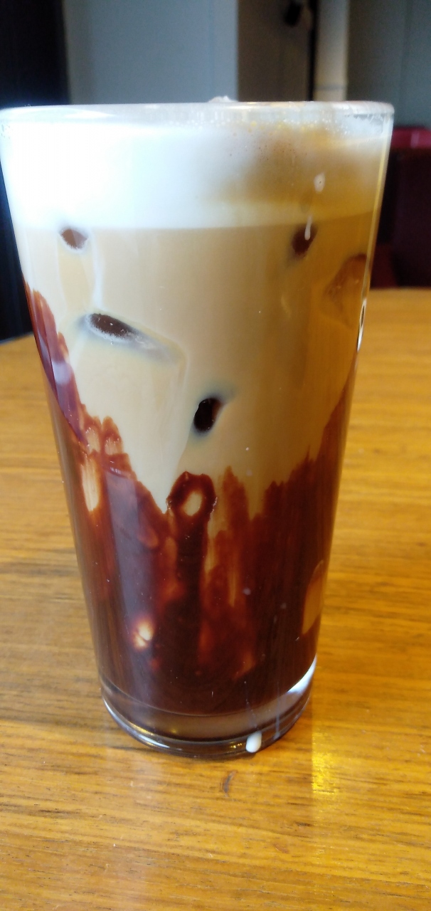 昼間の休憩利用でチェリビポテトとアイスカフェモカを。繁華街中心エリアのオープンなカフェなので、待ち合わせ・休憩・小腹満たしに向いていると思います。先払いセルフ式で料理の出来待ち呼び出しベル方式のお店です。