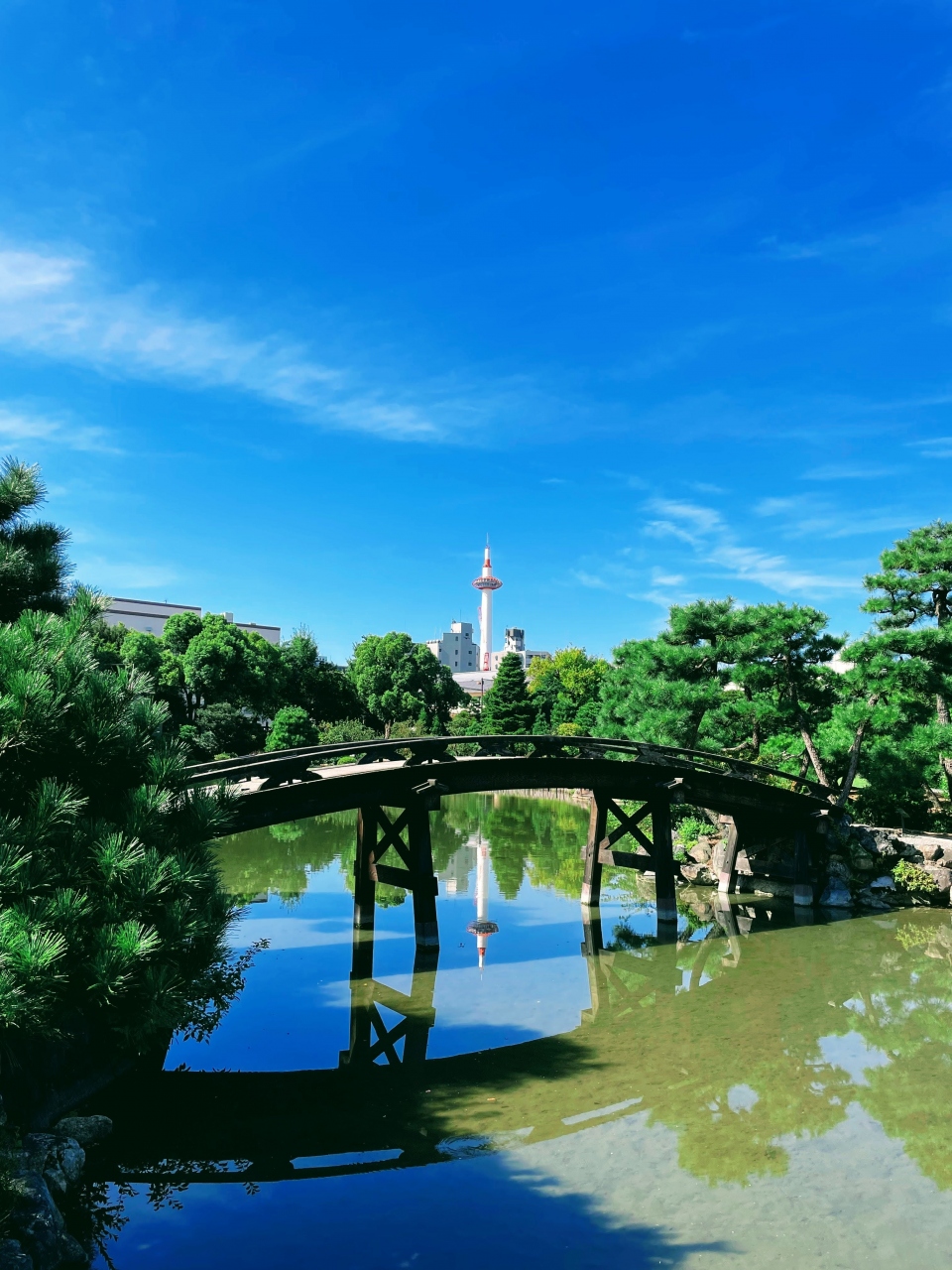 バスで近くを通るときに、塀越しにお庭らしきものが見えて、いつも気になっていたスポット。近くに宿泊したときに訪れてみました。訪れてみると、思っていたよりも広い庭園。池があり、苔庭があり、京都らしいお庭の特徴が集まっている感じです。印象的だったのが京都タワーの見えるお庭。園内にある、閬風亭の建物内ではアート展もありました。それほど有名なスポットではないのか、人が多くなく、ゆったりできました。