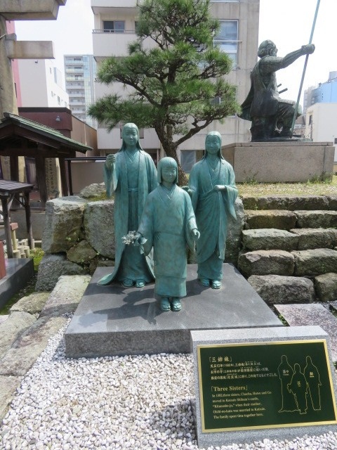 お市の方の像と少し離れて三姉妹の像がいずれも柴田神社に向かって立てられている。