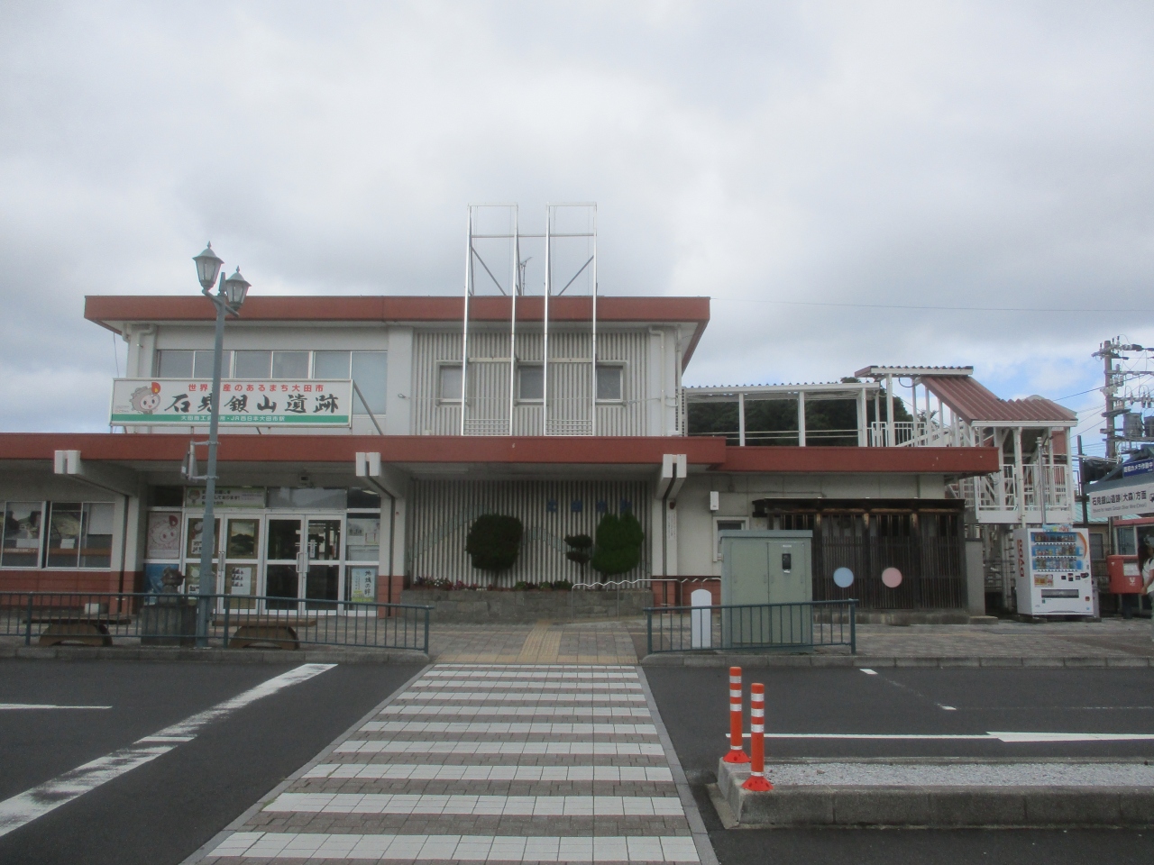 改札駅を出たら目の前に石見銀山遺跡方面のバス停がありました。東京のようにロータリーがあるわけではないので、分かりやすかったです。バス停には、私を含めて10人程度並んでいました。女性グループから石見銀山へ行くのかと尋ねられ、そうですと答えました。