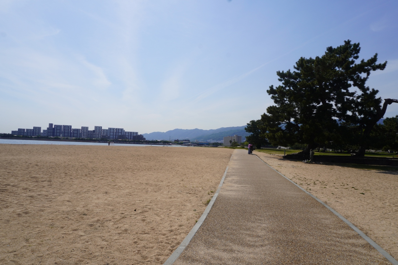 御前浜は、香櫨園駅の真南。夙川の河口付近に広がる砂浜です。見通しの良い砂浜を貫く遊歩道が整備されていたり、姿の良い松林があったりと長閑な浜なのですが、住宅地の方に波風が来ないよう高い防波堤で囲まれていて、陸地側から浜に出るには限られた経路からしか入ることができないので、それが要注意です。