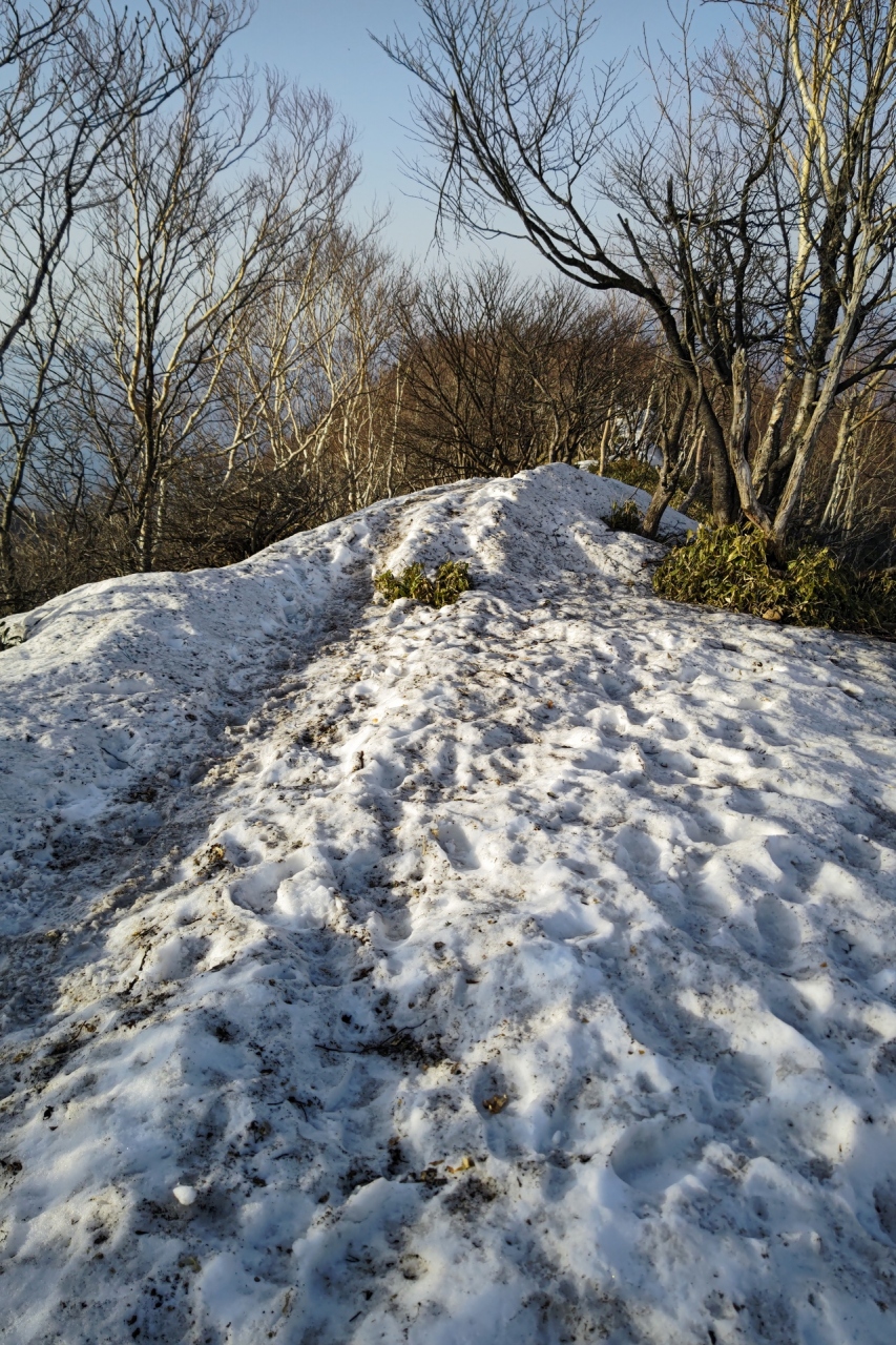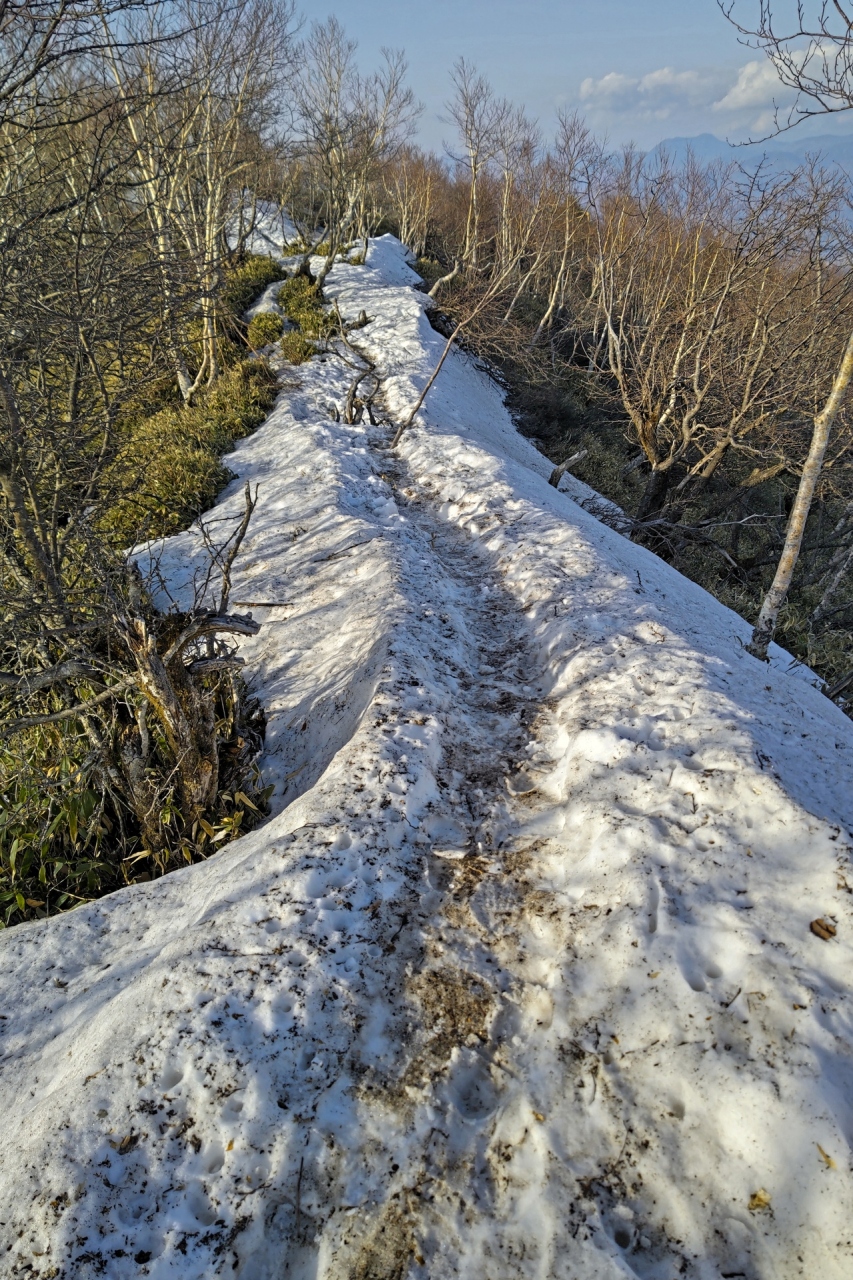 大沼から手軽に登れる日本百名山。テレビ番組で見ましたが、霧氷の時期は神秘的な美しさでした。自分の訪問時期は残雪がかろうじてあったものの、見頃は過ぎていた感じでした。ゴツゴツした岩を登っていきます。頂上から少し行った場所に開けたところがあります。