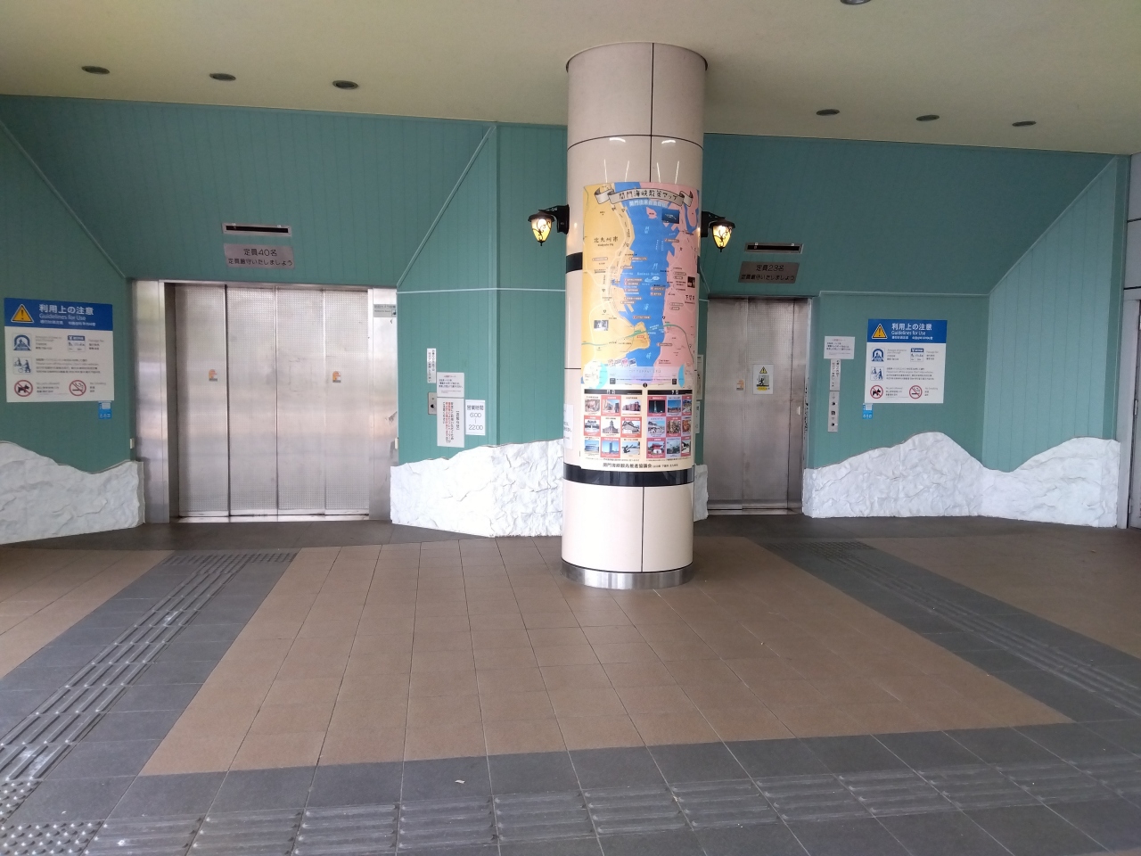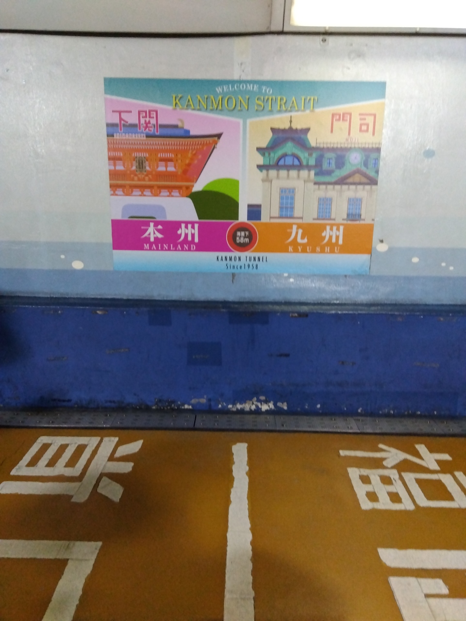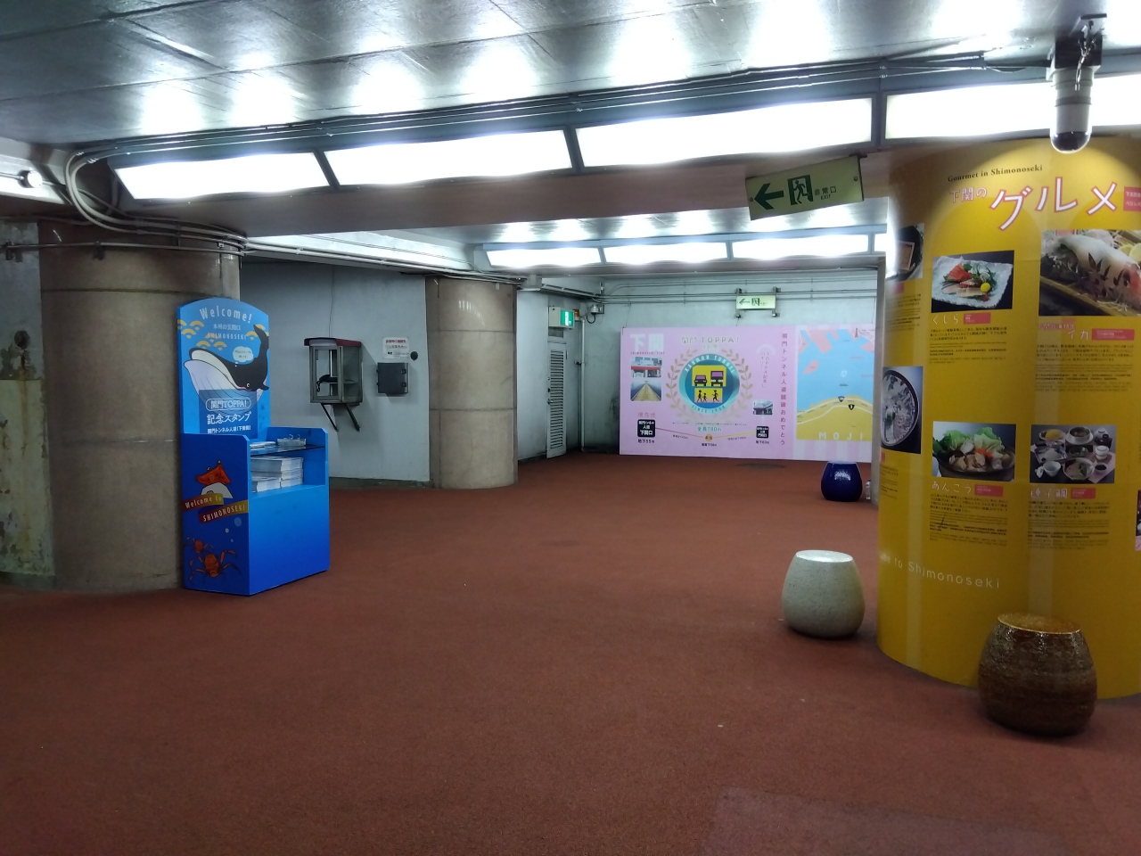 それぞれの入口にある昇降用のエレバーターで地下におります。それぞれのエレベーターホールには、関門海峡横断記念のスタンプが設置してあり、両方で押すと一つのスタンプになります。スタンプの台紙になっている「関門海峡・浪漫マップ」は、全体感がわかるし、イラストもかわいいです。