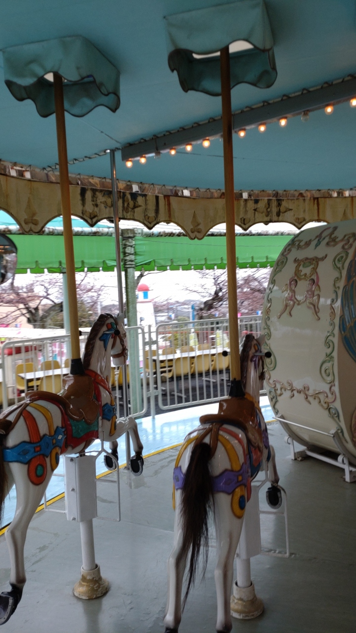 晴れなら桜祭り開催中の筈が雨で人も少なくない公園、集合迄時間あったのでお子様向けコーナーに行き、ドラマでよく見るメリーゴーランドに初めて乗りました。若いうちに乗るものですね。小さな観覧車にも乗りましたがあっという間に一回りでした。どちらもドラマシーン思い出し苦笑いでした。