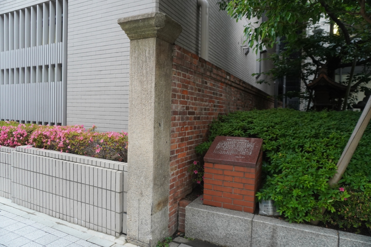 旧神戸居留地15番16番標柱は、通りの脇にひっそりと。コンクリートの標柱にレンガの塀が続いていて、傍らには説明書の碑があります。