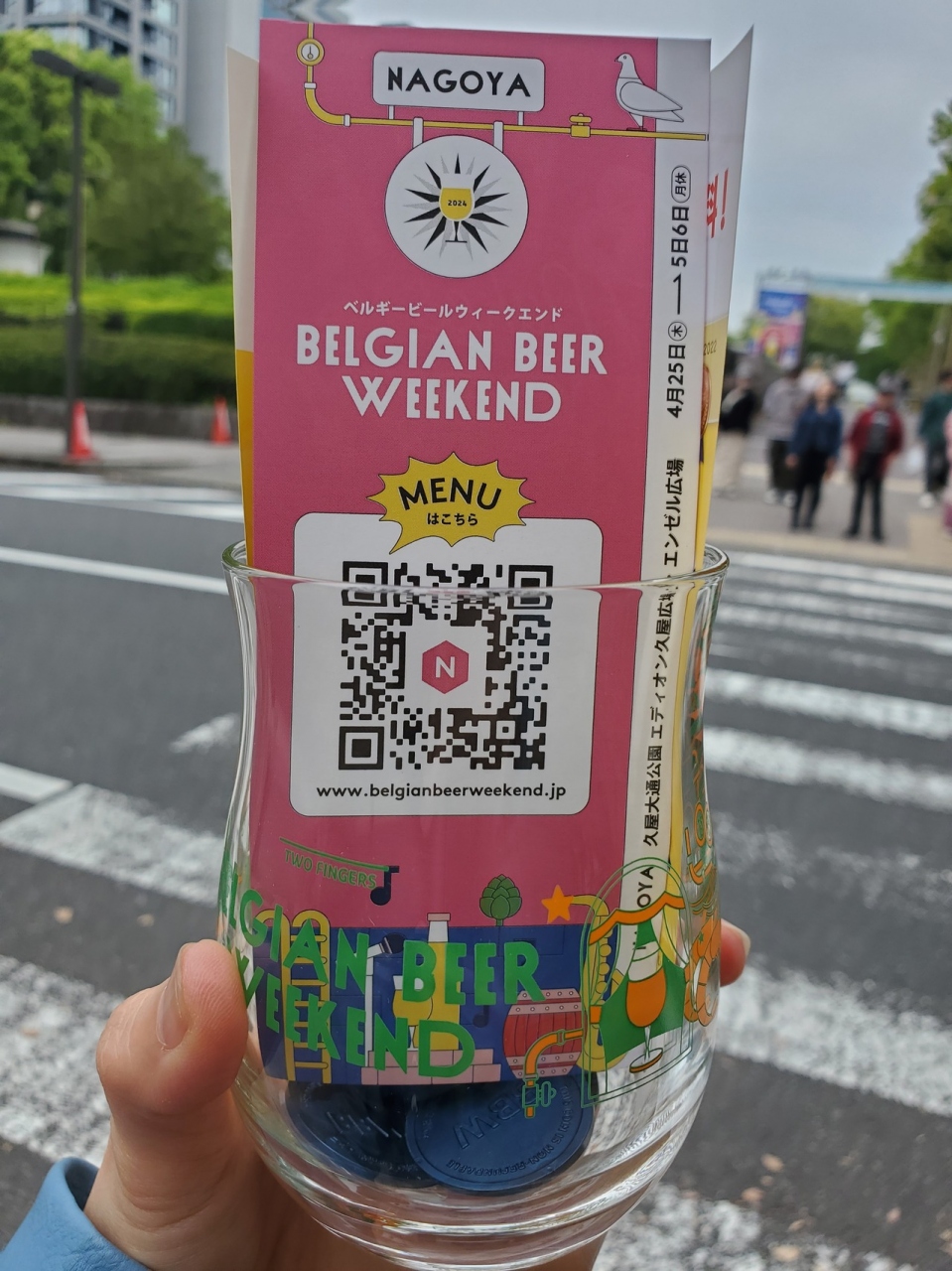 毎年全国で行われているベルギービールフェスです。名古屋でも開催しています。専用グラスと10枚の飲食用コインをスターターとして購入し、各ブースでビールや食べ物と交換します。ビール1杯でも安くても3枚は必要なので、外からも飲食物の持ち込み不可となっていますが黙認みたいな様子でした。毎年グラスを強制購入させられるのが難点です。毎回参加するたびに溜まっていきます。