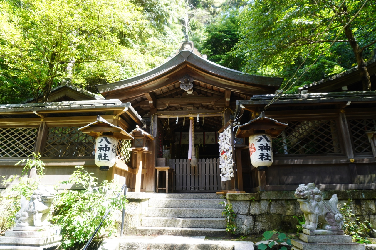 八神社は、銀閣寺の山門前から左折して奥に進んだところ。かつては慈照寺の鎮守社だったという神社です。石の鳥居から少し石段をしばらく上がった先が境内。限られた広さですが、拝殿、本殿が建っていて、緑に埋もれたような本殿の構えもなかなかです。