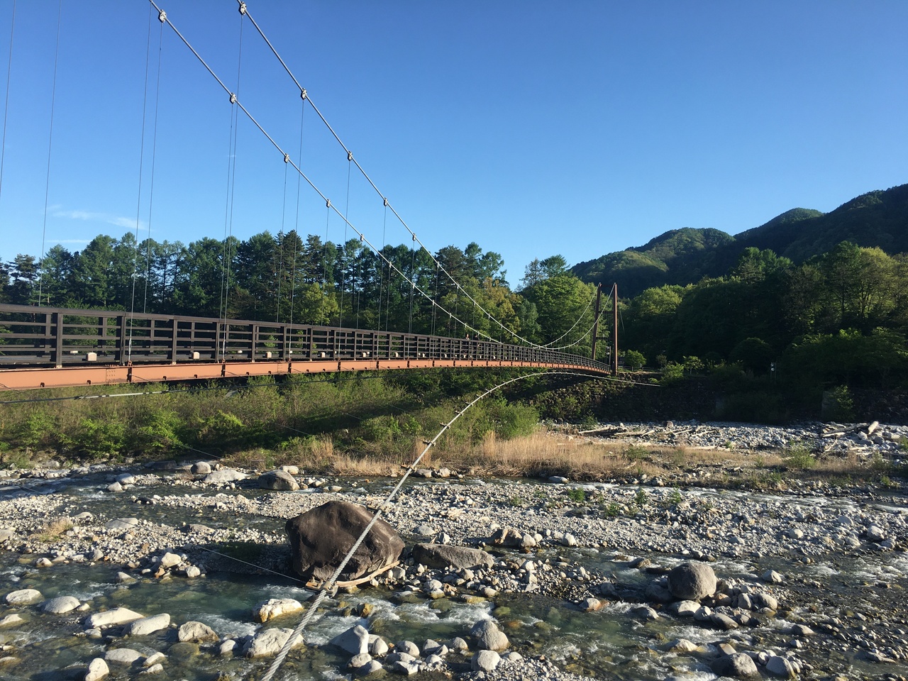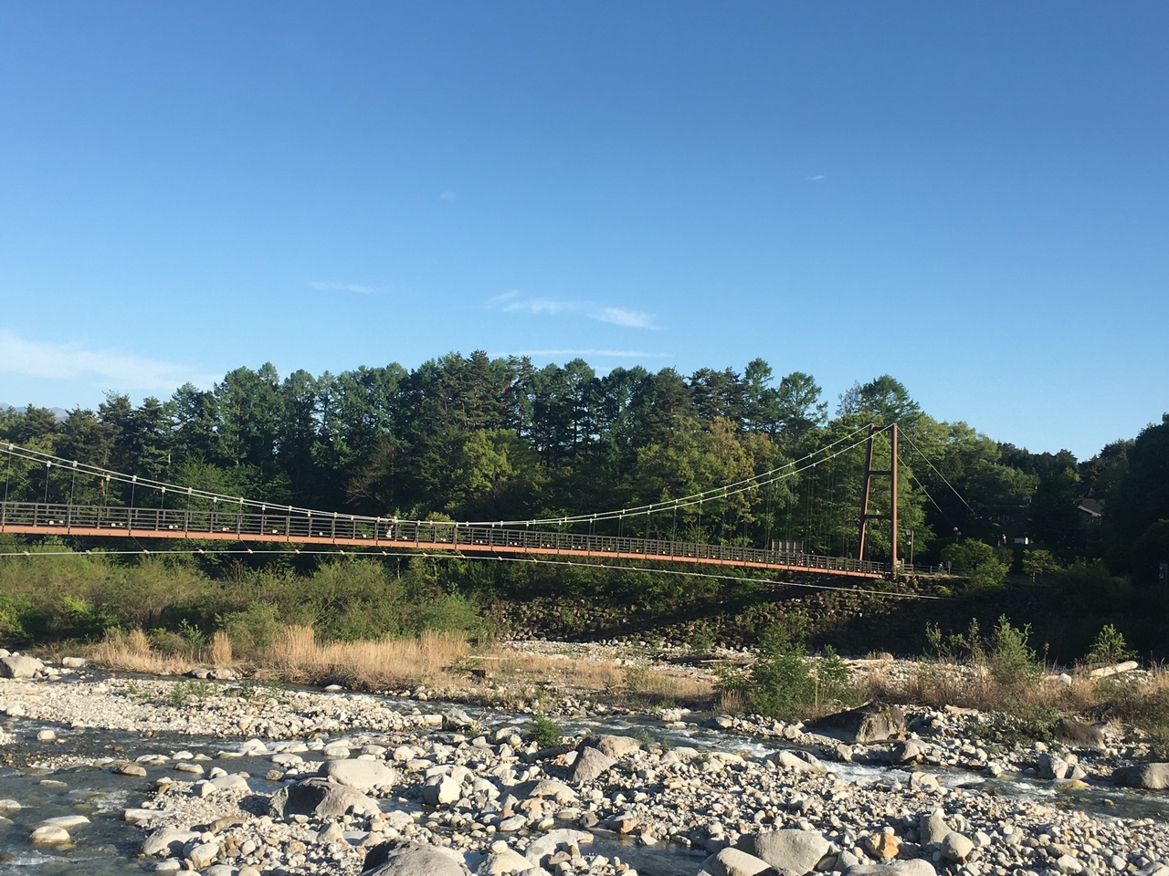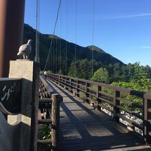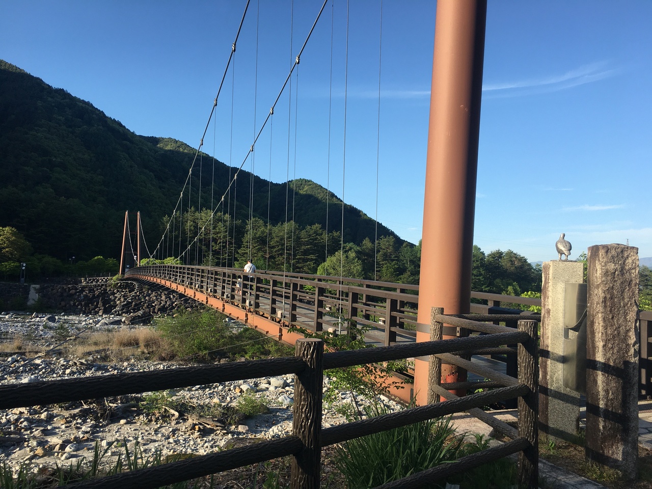 人のみ通行の長めの橋で、橋からは山々が見え、橋の下は川なので迫力がありました。渡っている時も景観が良いですが、橋を近くから見る風景も良いです。茶色系の色をしていて,周りの景色に合った橋でした。観光客が多い橋です。