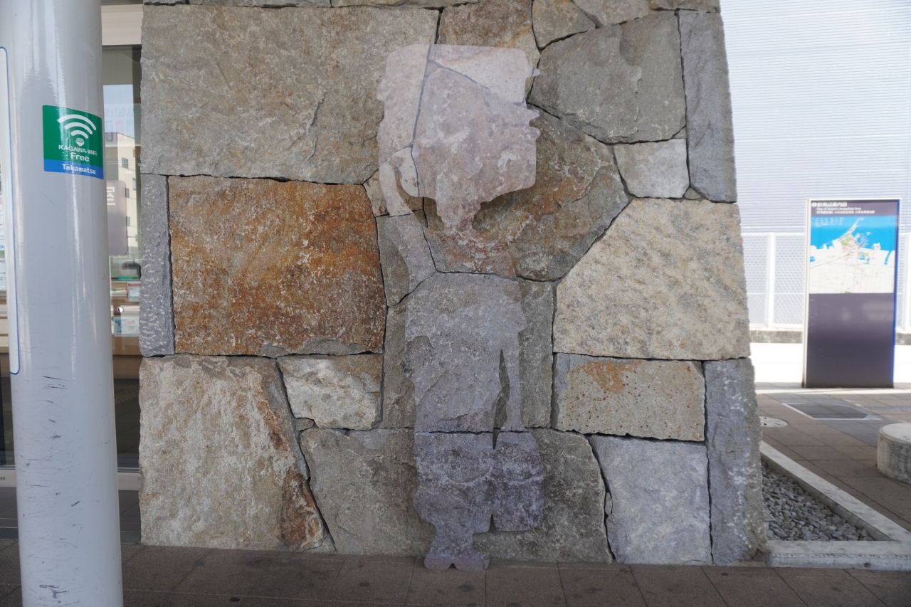 待つ人 / 内海さんは、瀬戸内国際芸術祭の参加作品だったものだと思いますが、高松駅前高速バスのバスターミナルのところ。建物の石の壁面になにかの影かシミのように作品がありました。これは本当によく見ないと気が付かない。見過ごしている人も多いと思います。