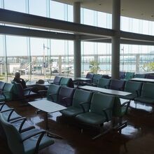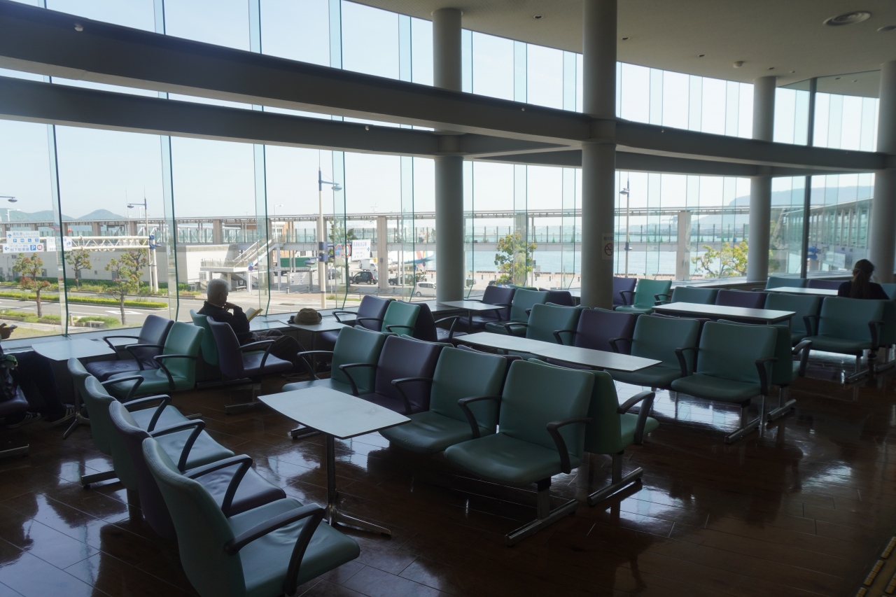 高松駅から高松港へは、この高松港旅客ターミナルビルの脇を抜けて行くペデストリアンデッキの通路が最短コースになります。脇を抜けずにビルの中に入ると、予想外に立派な待合室。悠々とした広さがあるし全面ガラス張りからの眺めも悪くない。使い勝手の良いスペースになっています。