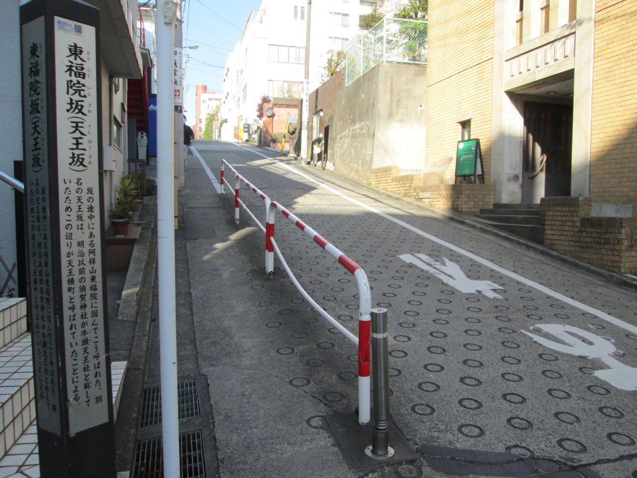 諏訪神社から北西に登り、愛染院と東福院を挟んだ道のある坂が東福院坂です。坂沿いの道に東福院があるところからこの名が付きました。道幅は広くない割と急な坂道ですので、散策では1回登るだけで済みますが、通勤で通る人は毎日大変ですね。周辺には上記寺社以外にも真英寺、戒行寺等もあり、この辺りを散策する場合には必ず通る坂道です
