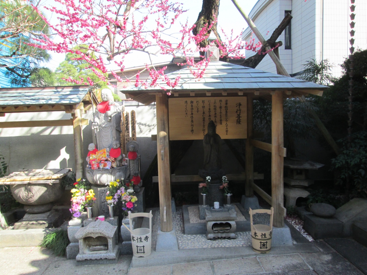 日蓮宗の一寺、創建は1670年、開山は観智院日詠上人、本尊は一塔両尊四士です。山門を潜ると毘沙門堂、水子地蔵、浄行菩薩像、本堂があります。歳のせいか、クリニックの診察券が多くなり、部位ごとにかけると時間がかかるので、浄光菩薩の頭から全体に水をかけ、良くなるようにお願いしました。墓地には国学者萩原宗固の墓があります。国学者宗固の名はここで、初めて知りました。名を知っている塙保己一の師であるので、記憶に残ります