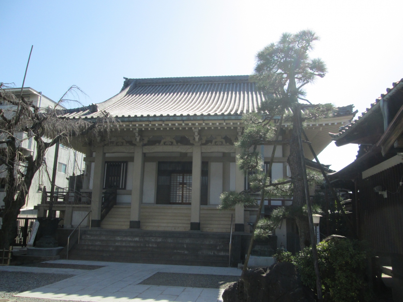 浄土真宗大谷派の一寺、創建は1607年、開山は周桂和尚です。山門を通ると正面に本堂があります。墓地には剣客榊原健吉、落語家七代目春風亭柳枝、日本舞踏家花柳寿美等の墓がありますが、墓地には入らないでという注意書きがあり、入れませんでした。山門前に榊原健吉の説明版があり、これは興味あるなと入れば墓地には入らないでという注意書き、説明版に付記するまたはホームページ等で、この様な注意書きは記して欲しいものです。本堂はコンクリート造りで、形は木製の本堂とは変わりませんが、明確にコンクリート製とわかるので、お寺に参ったという感じがしません