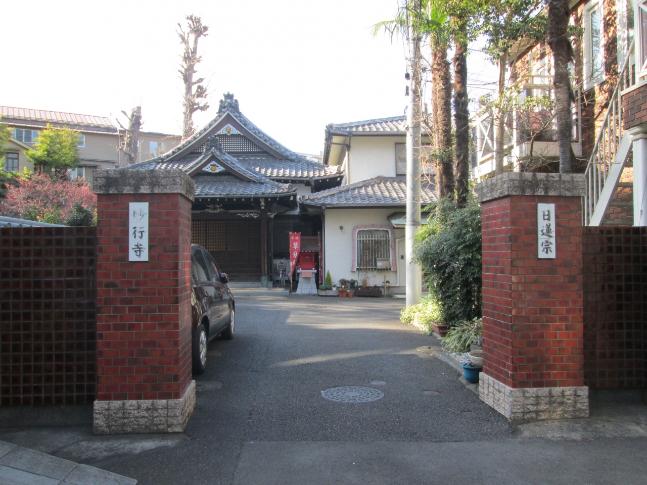 日蓮宗の一寺、創建は不詳、十五世紀中頃、頻迦法印が日蓮宗に改宗、その後廃寺、1614年、本立院日純和尚が開山し、基礎を確立する。本尊は釈迦牟尼仏です。山門を通ると本堂、身延山の稲荷尊神を草分けして、当山に奉安された草分稲荷がある。通常寺の門は木製か石門柱が多いのですが、妙行寺の門柱は赤いレンガで、珍しいと思います。これは江戸時代将軍家から赤門建立を許可された名残を留めるために、赤いレンガ造りの門柱を建てたように想像します