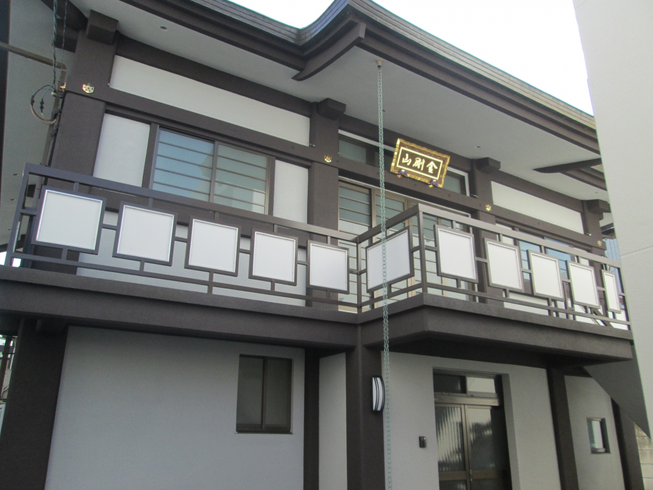 門を通ると二階建てビルの二階に本堂があります。最近都心のお寺の本堂はコンクリート