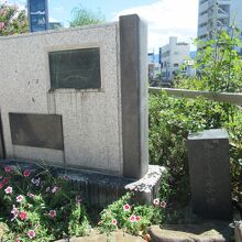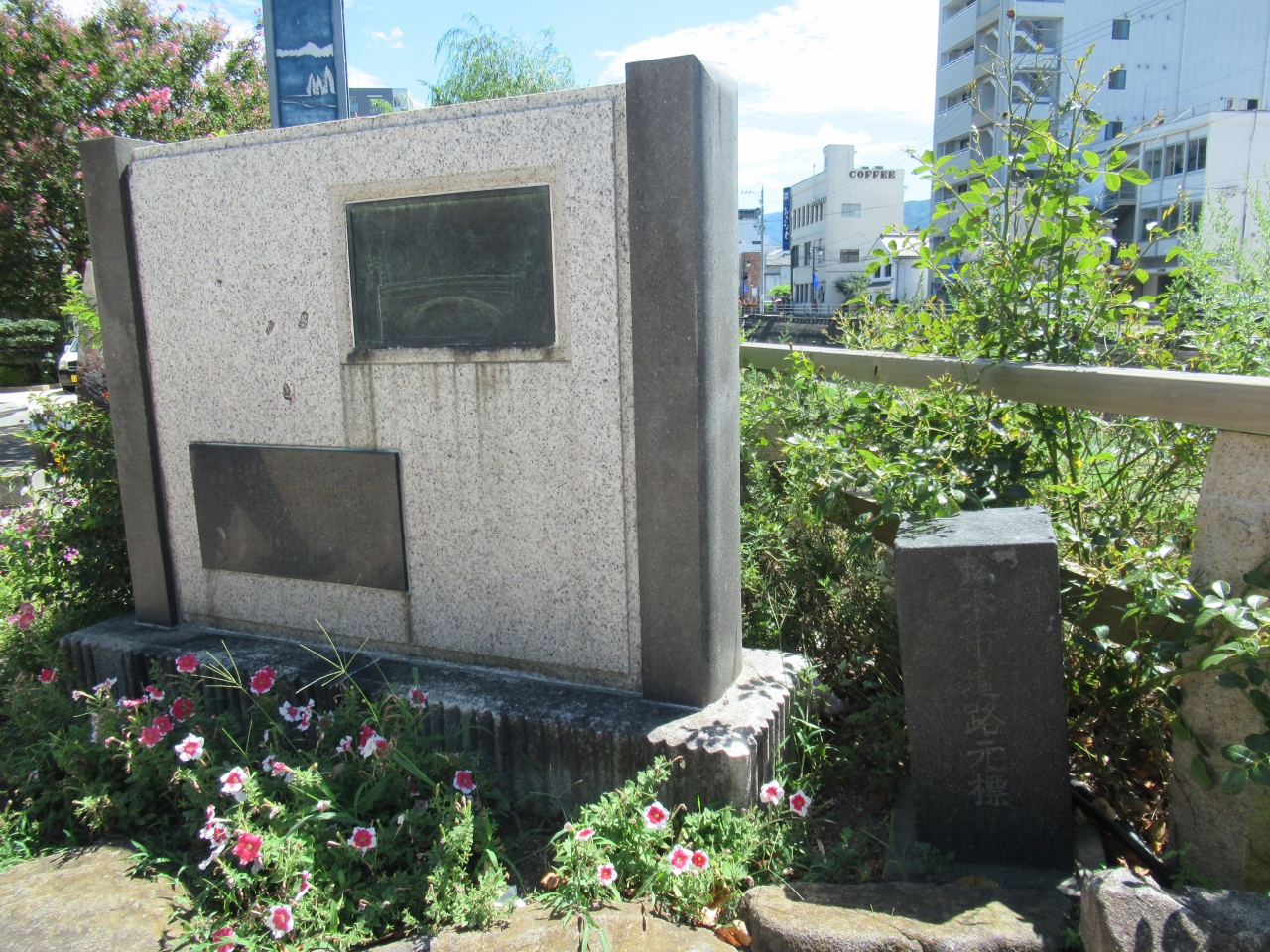 松本城入口から300mほど、女鳥羽川に架かる千歳橋のたもとに造られた、花いっぱい運動発祥の地と刻まれた碑の横に、草に隠れるようにして40㎝ほどの碑が建っています。松本市の道路の起終点を示す標識ですが、観光で訪れるような場所ではないと思います。元標の隣には、大手門の石垣を使用した千歳橋と橋の変遷を説明したレリーフが建っています。