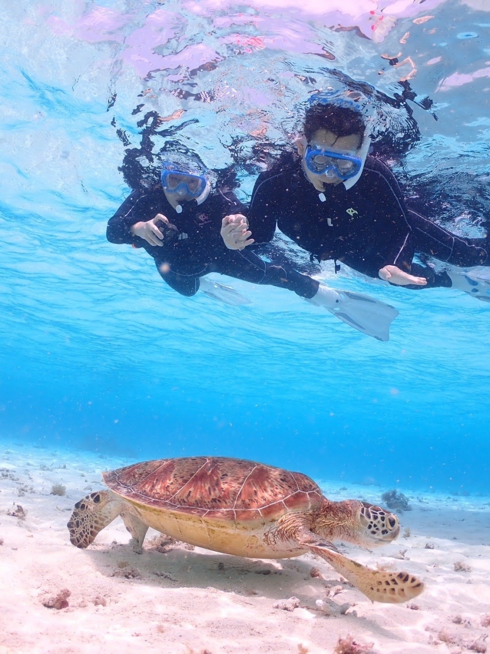 美しいサンゴ礁の海でポイントを替えて2か所のシュノーケリングを楽しんだ後、ウミガメさんのいる白砂の浅瀬へ。
