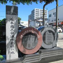 松本城入口から500mほど、白壁となまこ壁の土蔵が建ち並ぶ、中町通り沿いの駐車場に造られた藤棚下に、石柱と商工会議所創立100年を記念した丸い碑が建っています。碑には100年前に建てられた趣ある商工会議所の建物と、現在の建物の写真が張り付けられています。現在の商工会議所は発祥の地碑があるところから少し離れたところにあります。
