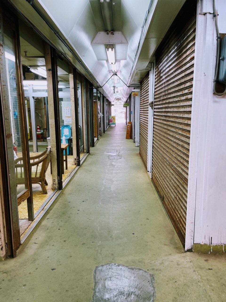 沖縄の本部にある町営市場。ここの前の通りは、何度も車で通っていて、今まで素通りしていたスポット。那覇の牧志公設市場のような、魚介や肉類などのお店が並んでいるものを想像していて、実際訪れてみたら、ぜんぜん違いました。昔は、そんな市場のような感じで、今はシャッターが降りているお店がかなり多く、そんな中、カフェや雑貨屋さんなどがお店を出しています。そんなに人が混む感じでもなく、ブラブラと歩いて、お店を見て回るスポットとしてはいいと思います。