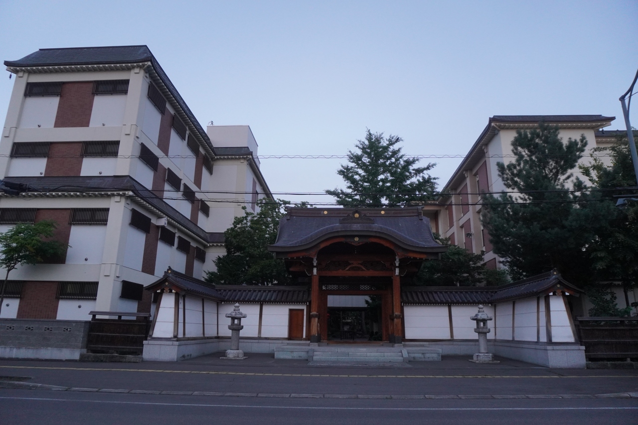 旭川の市街にはいくつか寺があるのですが、どれもがちょっと異様なほど大きいですね。曹洞宗の大休寺もその一つ。正面の唐門から境内に入りますが、境内は周囲を巨大なビルに囲まれていて、これは何のための建物なんでしょうか。もしかしたら、納骨堂?北海道以外ではあまり見ない構えだと思います。
