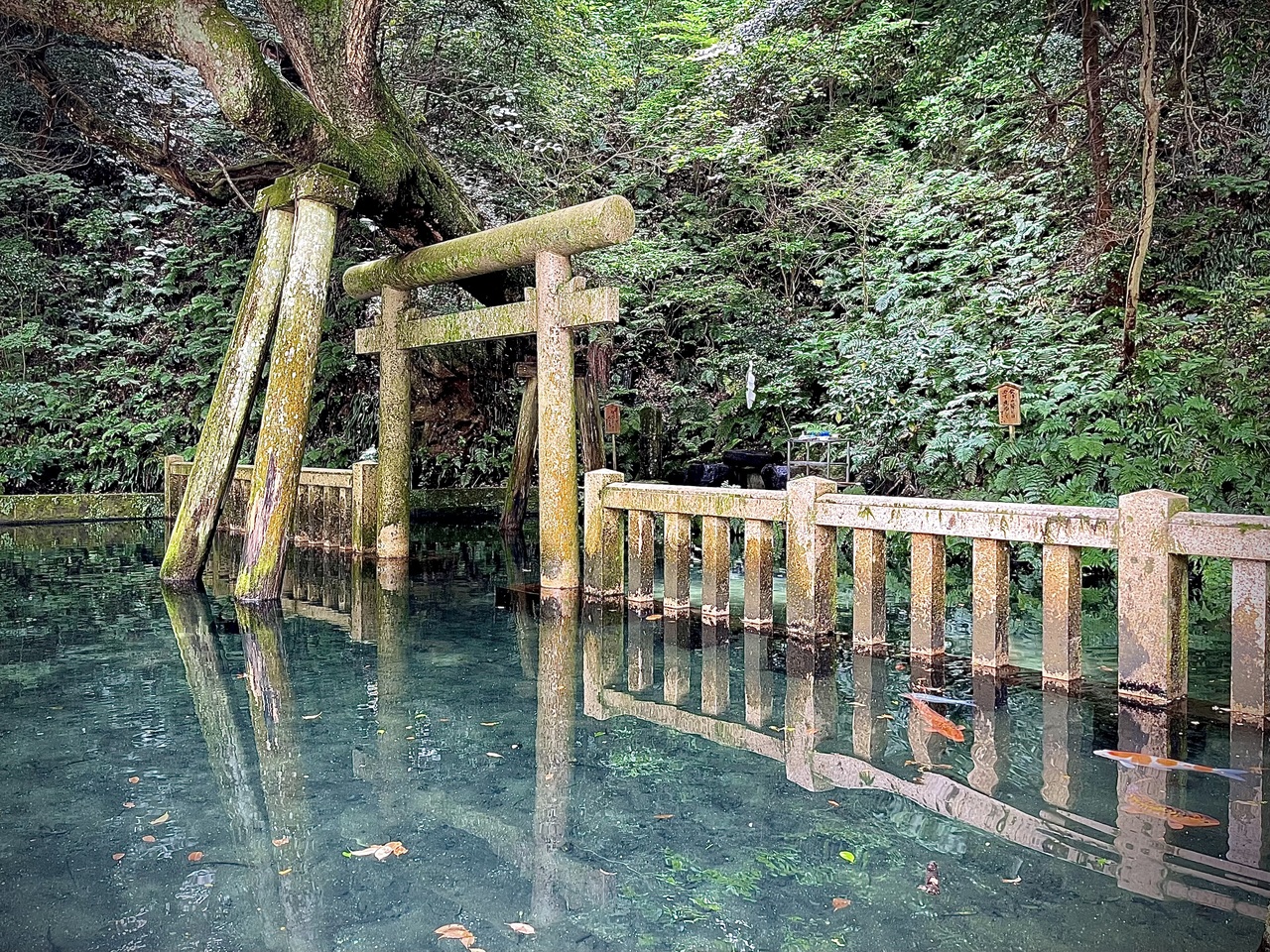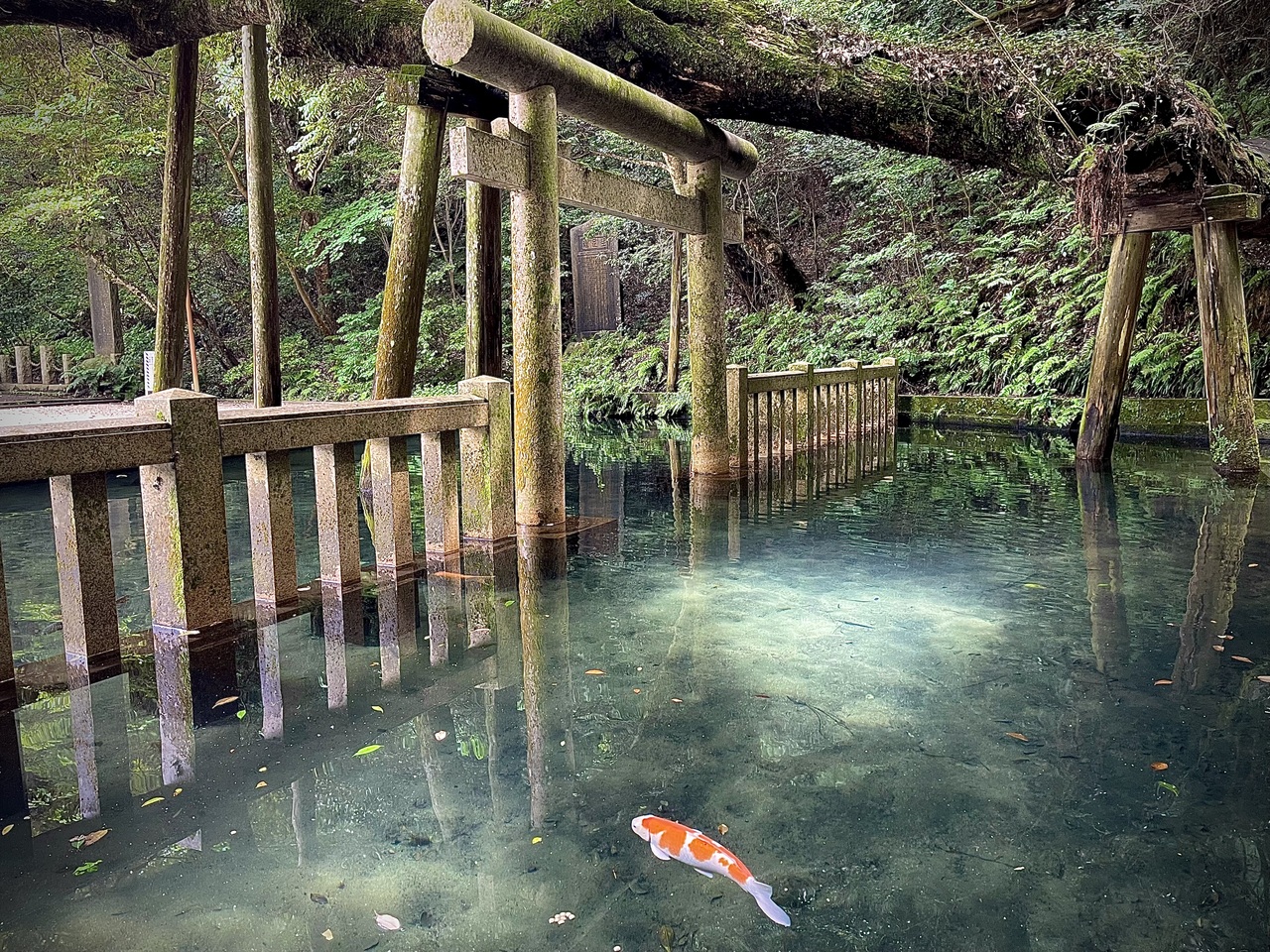 鳥居の左右にある玉垣と言うか瑞垣と言うか、そこに水平に置かれている貫(ぬき)?で、池の縁石や正面のひら地、立て看板を覆い隠すアングルでしゃがんで撮りました。