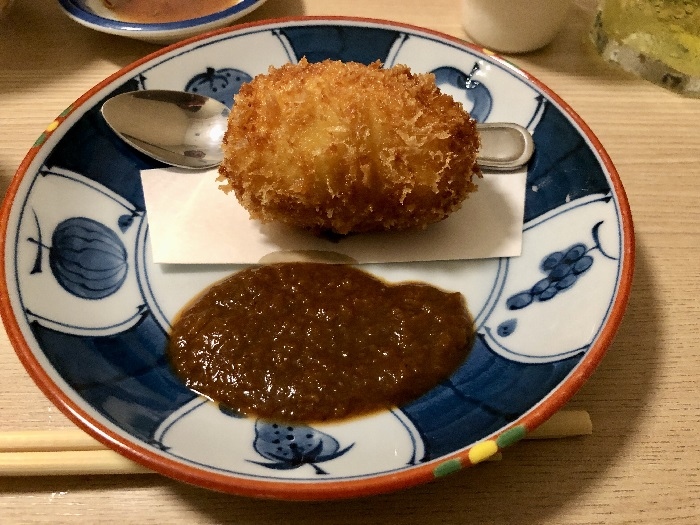 凌ぎ:海老出汁の冷製半田そうめん、炊物、揚物:車海老のクリームコロッケ