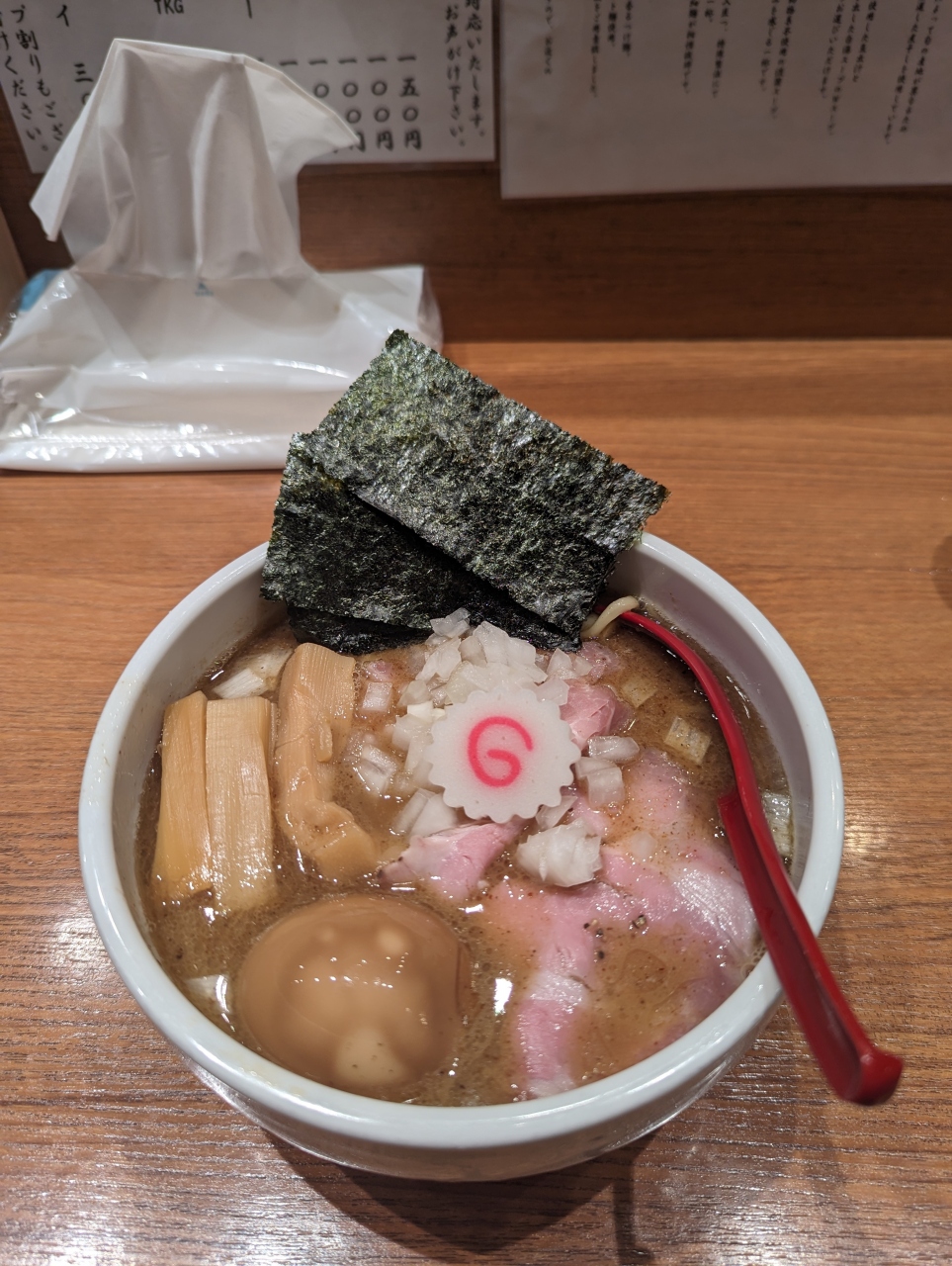 店名にもある通り、スープには煮干しをメインとした出汁が使われおり、濃厚な味わいを彷彿させる見た目をしていますが、比較的あっさりとしており、魚介臭さもほとんど無く、また後味もほとんど残らない、という味付けだと感じました。ガッツリとした濃厚な味を楽しむには物足りなさを感じますが、飲み会などの酒宴後の胃に優しい一杯を食べる目的としては丁度いいかもしれません。