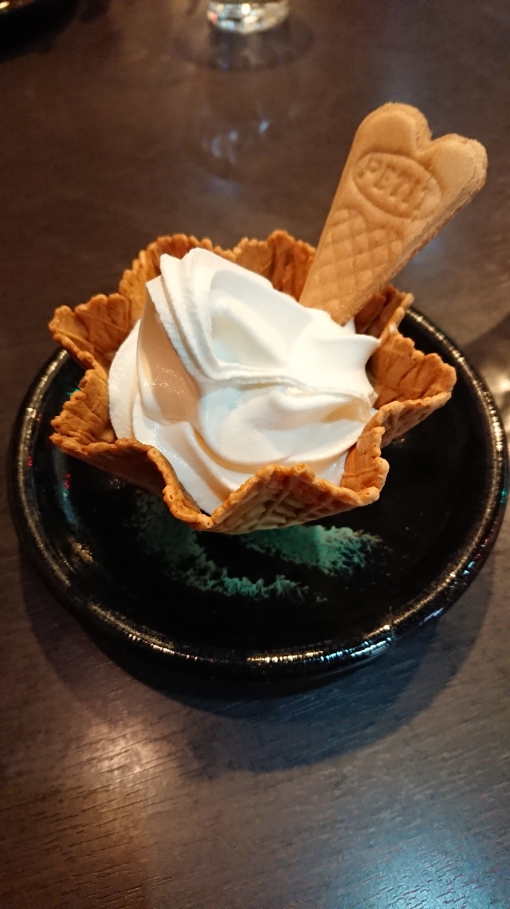 ここのソフトクリームはあっさり系で皿がコーンで食べられる。クッキーも刺さっていた。