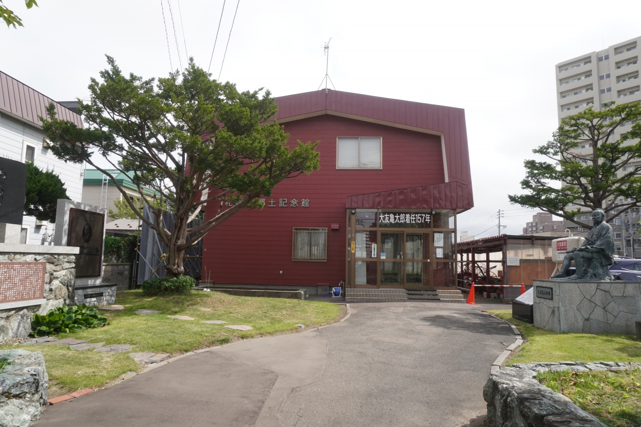 札幌村郷土記念館は、札幌村の開拓に力を尽くした大友亀太郎の偉業を記念する施設。少し古いですが、けっこう立派な建物です。ここは大友亀太郎の役宅跡。敷地内にはお亀太郎の銅像があって、二宮尊徳の門下だったころからの経歴とか詳しい説明板も建っていました。