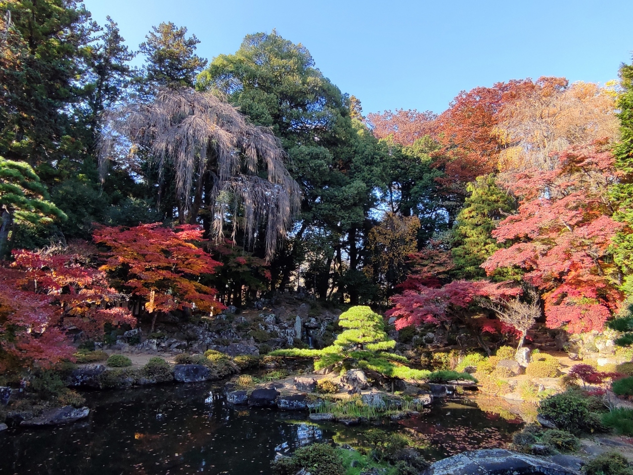 池に落ちたモミジの葉や鯉が泳ぐ姿など