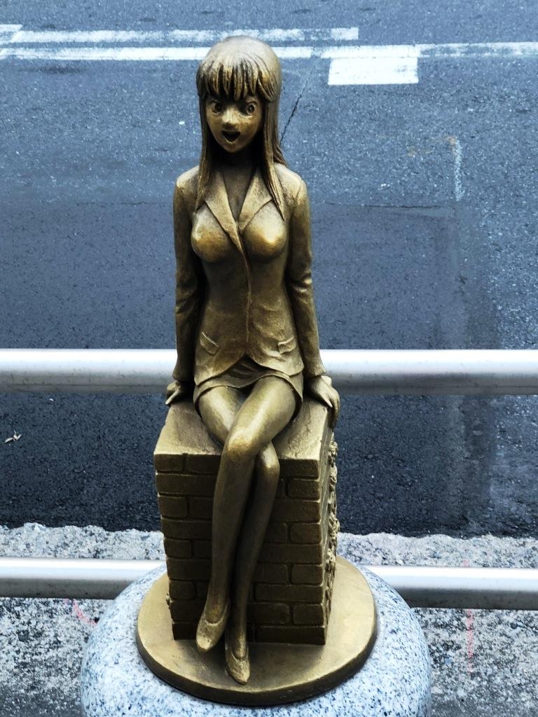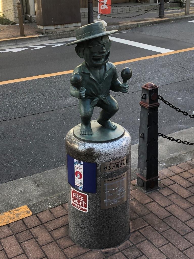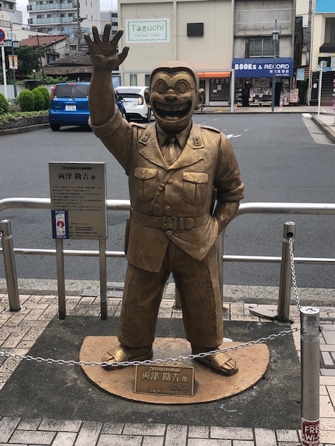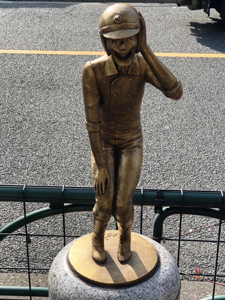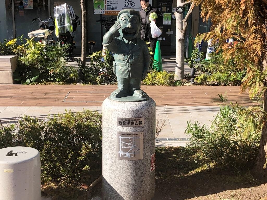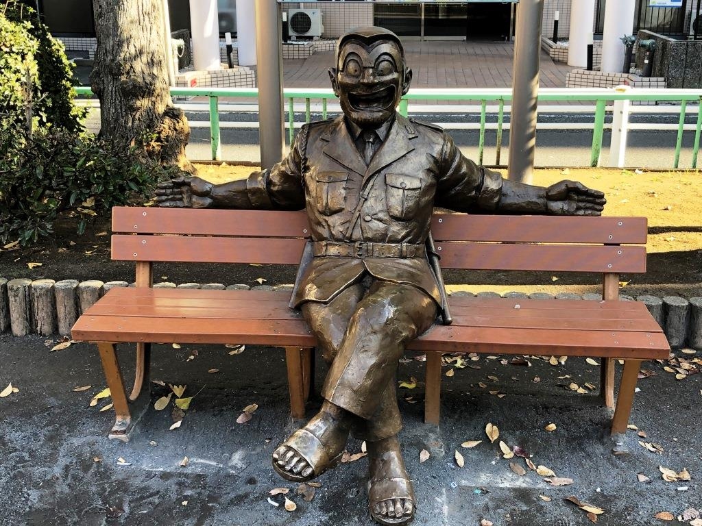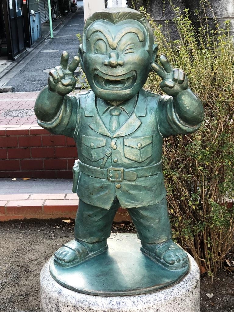 JR「亀有駅」の改札口を出て左方向に進むと「亀有駅北口」です。「亀有駅北口」を出るとすぐ正面の目の前に、「両津勘吉像」があります。片手を挙げ、「よお、お帰り!」とでも言っているような気さくで、温かい笑顔で出迎えてくれます。雪駄を履いた警察官はまずいないと思いますが、両さんには警察官に似つかわしくないカッコウが似合いますね。本当に、両さんの「よお」という掛け声が聞こえてくるような錯覚にとらわれます。また、北口のロータリーには、交通広場があり、両さんが「ようこそ亀有へ!」と出迎えてくれる看板もあります。「両津勘吉」は、「葛飾区亀有公園前派出所」に勤務する巡査長です。「両津勘吉」は、東京都台東区千束の佃煮屋「よろづや」を営む両津家の長男として生まれました。「両津勘吉」の身体的特徴は、角刈り、大きな目、体毛が濃く、そして、何と言っても左右つながった極太の一本眉毛です。「両津勘吉」は、常人離れした体力と生命力を持っているほか、外見とは違い、手先が器用で多数の資格や免許を持っています。そして、いたずらと金儲けが大好きで詐欺まがいな行動も多い反面、正義感は子供の頃から強く、困っている女性やいじめられっ子などには体を張って守るなど、義理人情に厚く困っている者を放っておけない性格で下町の住民からの人望も厚く、愛されています。