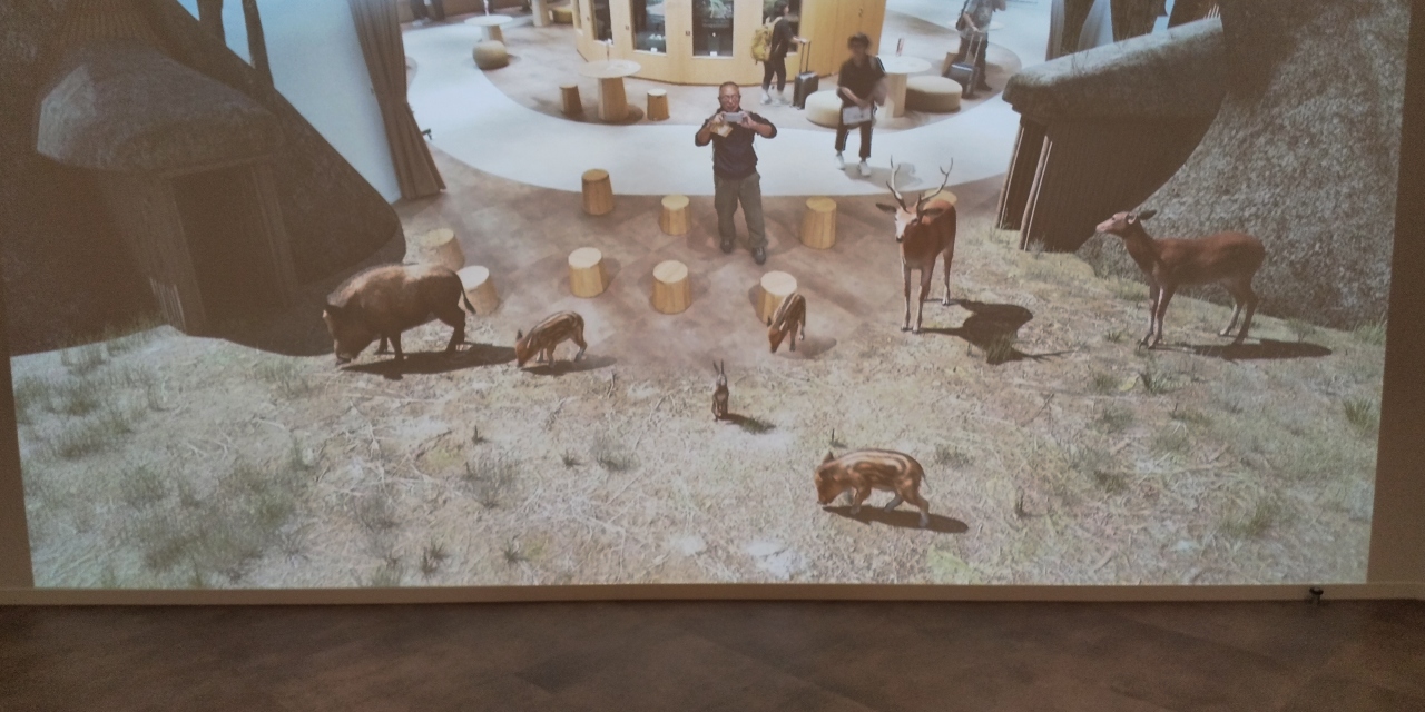 スクリーンの中に縄文の村があり、住居のまわりには