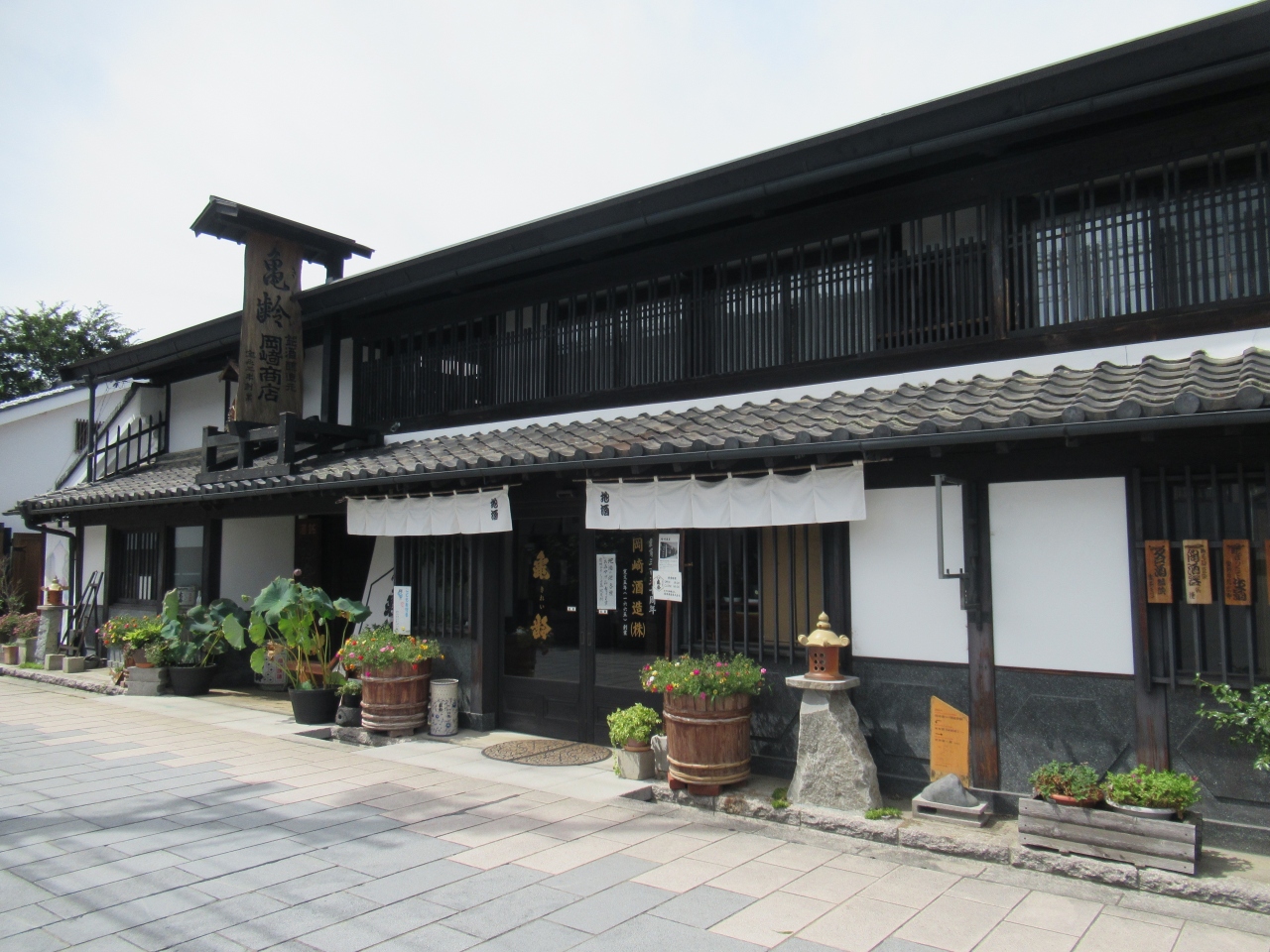 柳町の通り沿いに建つ酒造です。創業350年以上の老舗酒造で、女性が杜氏を務めています。亀齢(きれい)という銘柄の日本酒を中心に数種類の酒を醸造しています。酒蔵を見学することはできませんでしたが、外観は格子がはめ込まれ、店先には樽に植えられた花や蓮が飾られ、落ち着いた雰囲気の店構えでした。希望すれば試飲することも可能です。